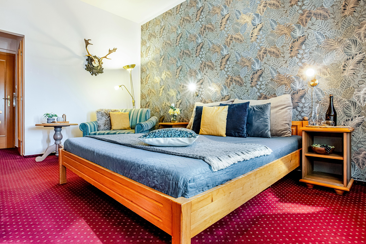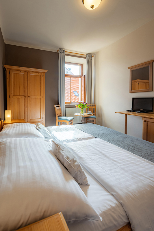 pokoj s manželskou postelí či 2 samostatnými lůžky, s možností 1 přistýlky formou samostatného lůžka, sociální zařízení