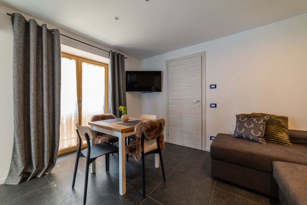 45 m² - 1 ložnice s manželskou postelí, obývací pokoj s kuchyňským koutem a rozkládacím gaučem pro 2 osoby (160x200), prostorné sociální zařízení se sprchovým koutem typu walk-in (vstup pouze z ložnice), balkon s panoramatickým výhledem; apartmán je situovaný ve druhém patře