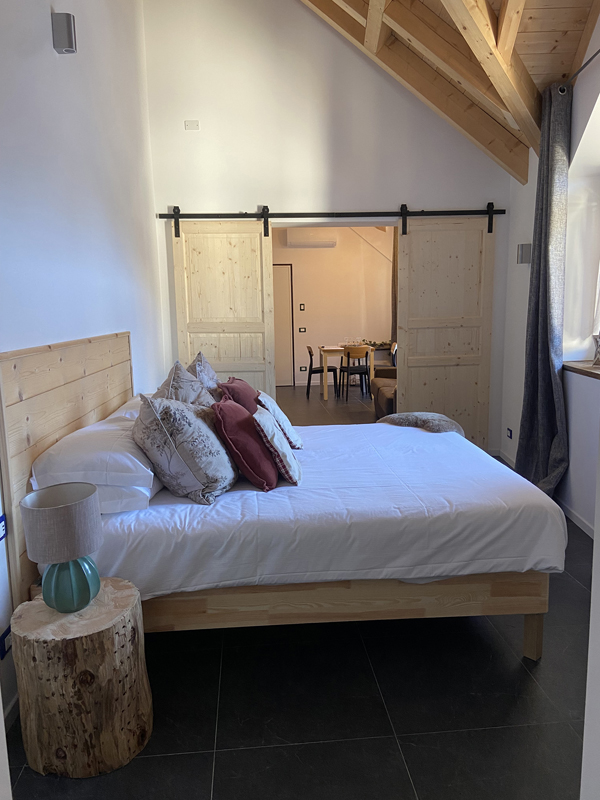 41 m² - 1 manželská postel v rámci neuzavřeného zvýšeného patra, obývací pokoj s kuchyňským koutem, manželskou postelí a rozkládacím gaučem pro 2 osoby (160x 200), sociální zařízení se sprchovým koutem typu walk-in, balkon; apartmán je situován ve druhém patře; v apartmánu není možný pobyt se psem