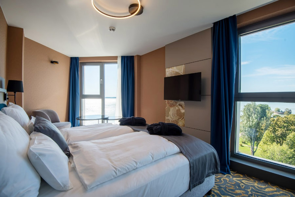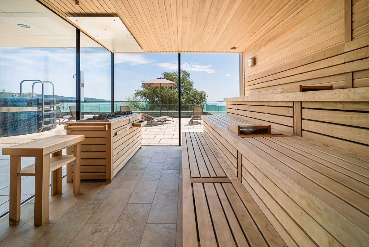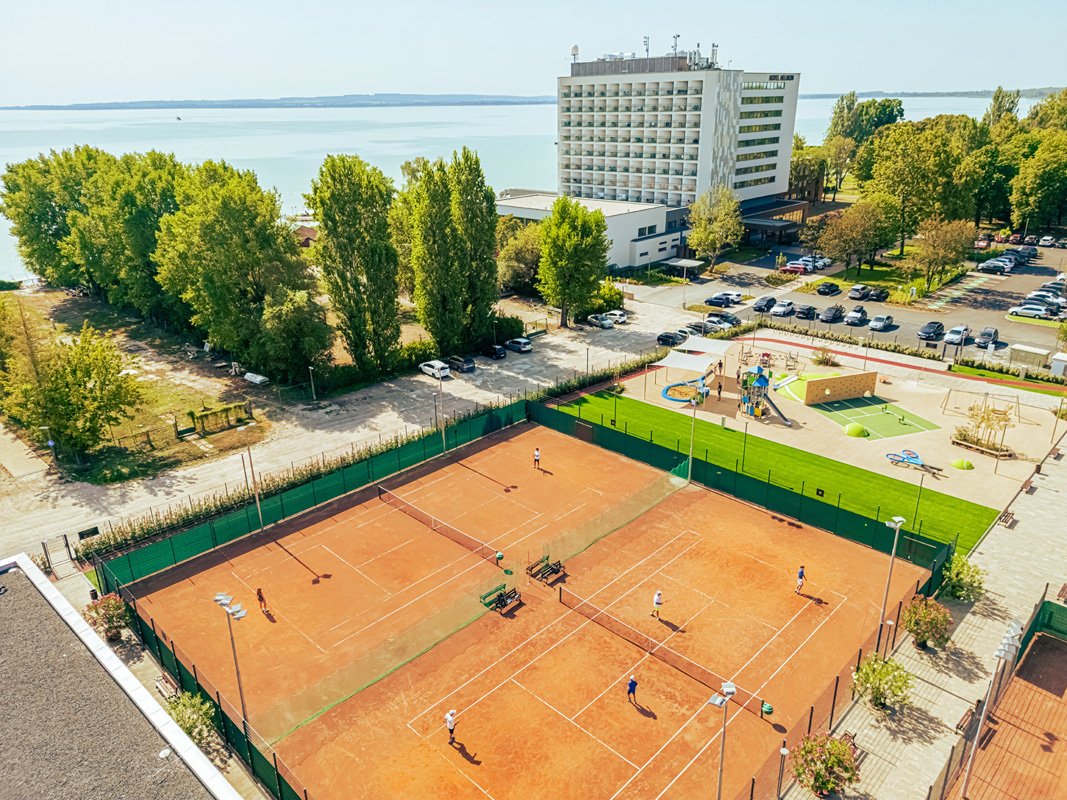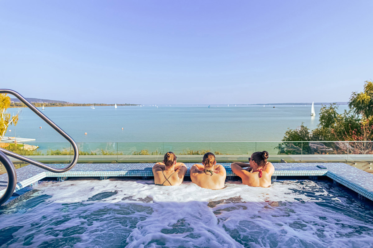 rozsáhlé WELLNESS & SPA zázemí s oslnivým panoramatem Balatonu – krytý bazén, venkovní a vnitřní jacuzzi, saunový svět, dětský bazén, dětské brouzdaliště, masáže*, kosmetika*, tenisové kurty*, půjčovna jízdních kol*, soukromá pláž, fitness centrum