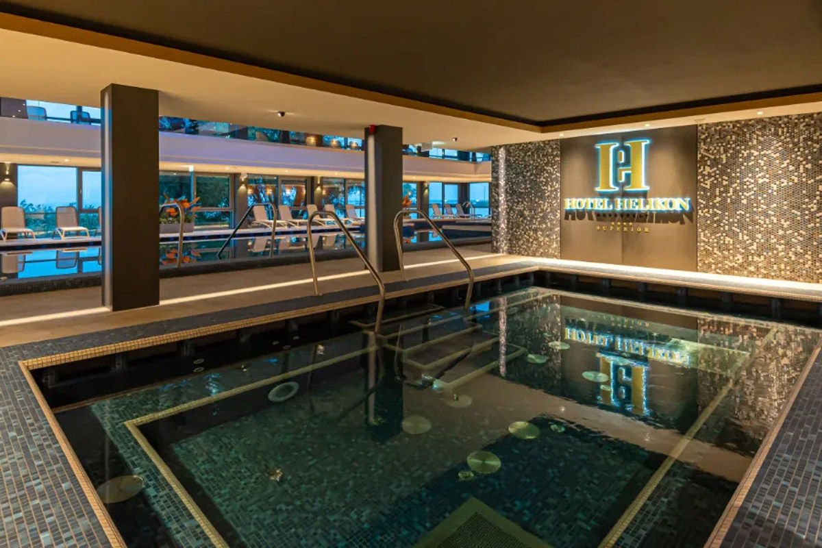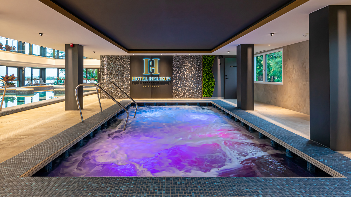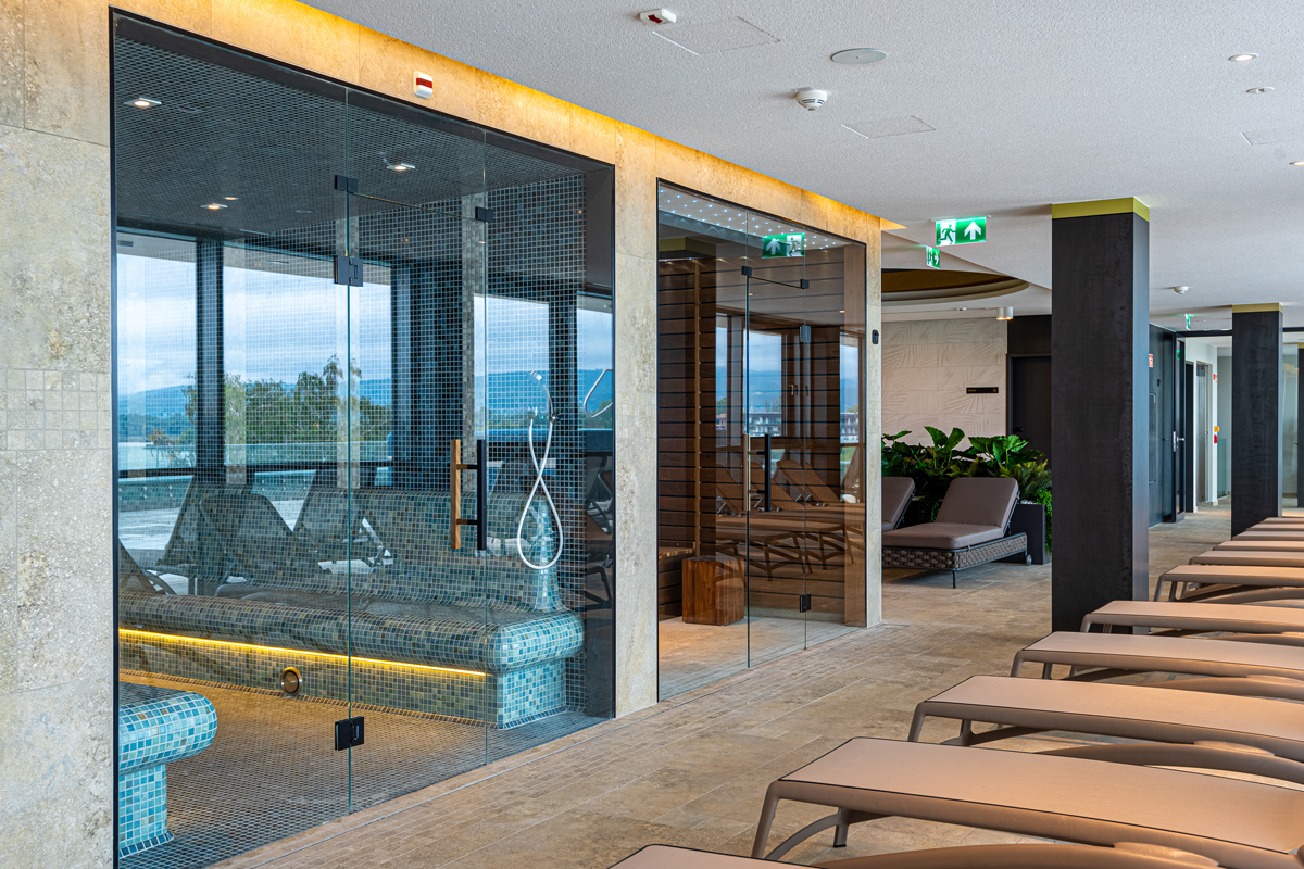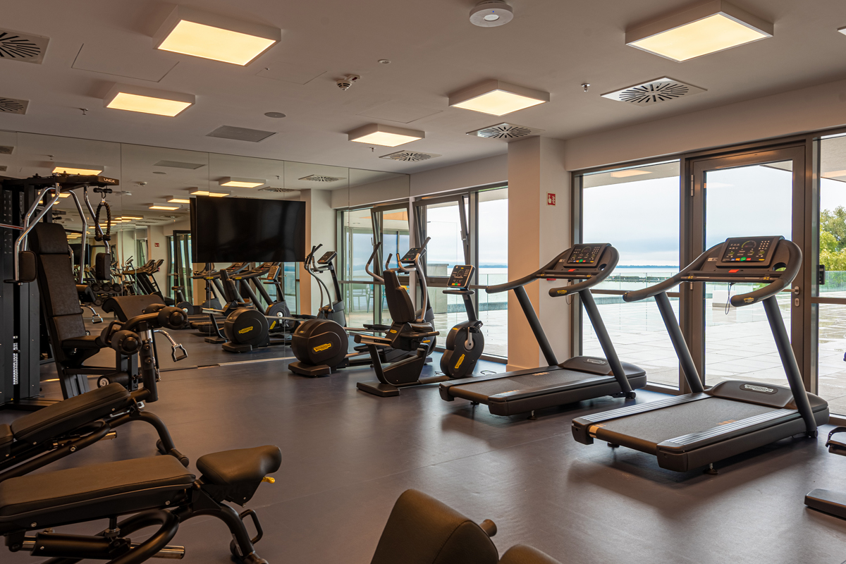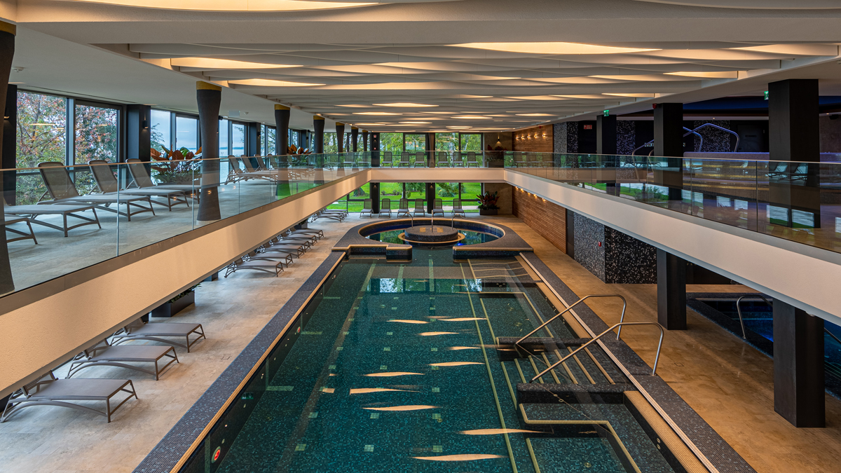 rozsáhlé WELLNESS & SPA zázemí s oslnivým panoramatem Balatonu – krytý bazén, venkovní a vnitřní jacuzzi, saunový svět, dětský bazén, dětské brouzdaliště, masáže*, kosmetika*, tenisové kurty*, půjčovna jízdních kol*, soukromá pláž, fitness centrum