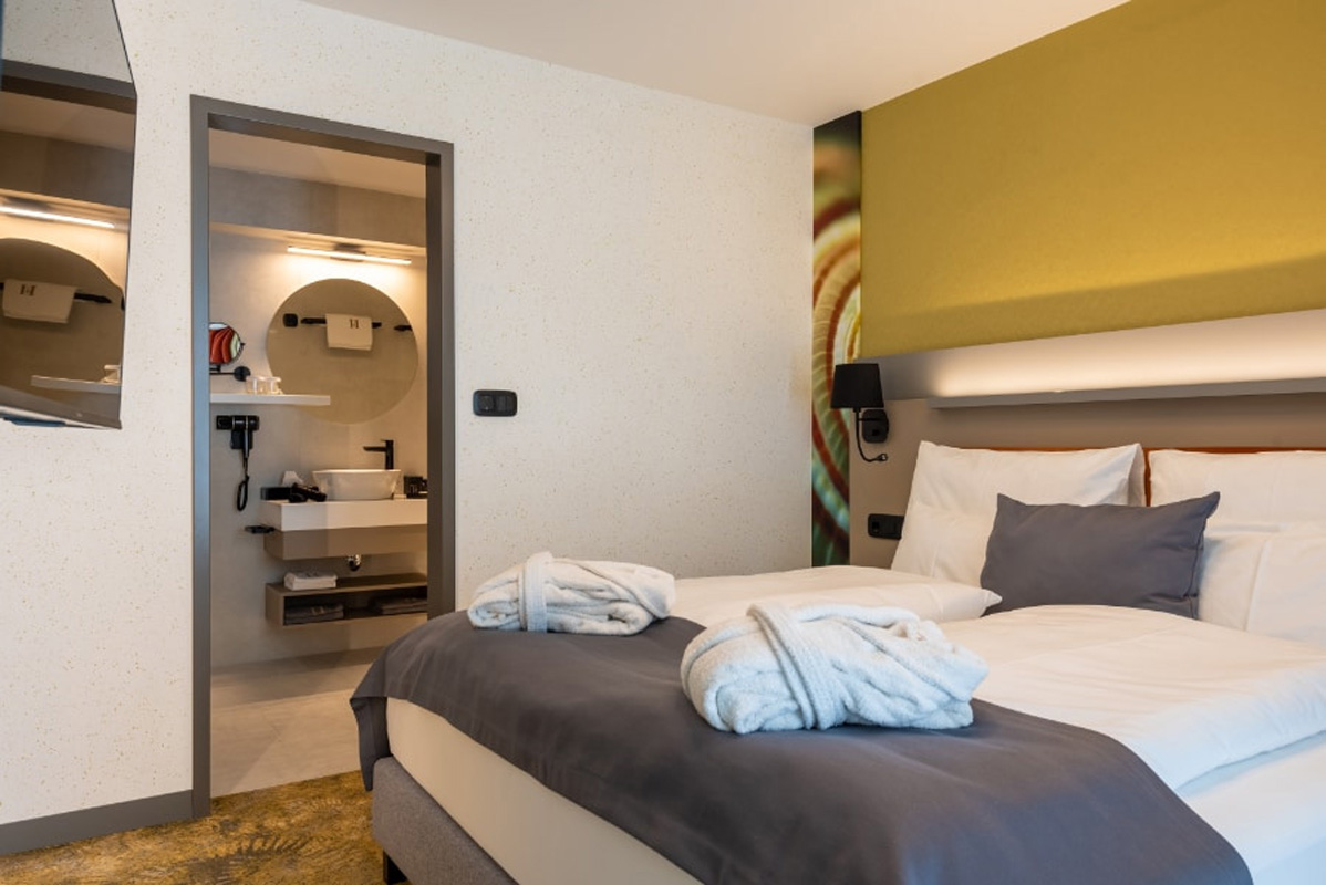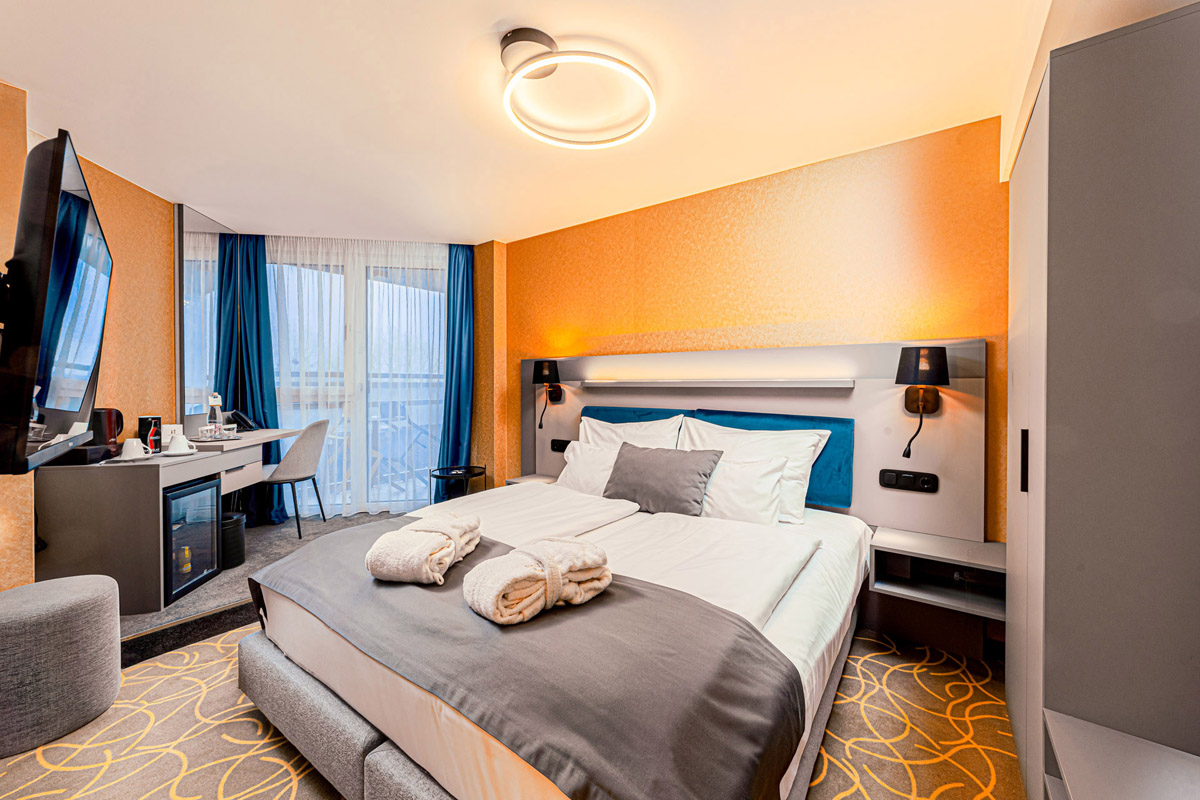 (cca. 20 m²) - pokoj s manželskou postelí, koupelna s vanou/sprchou a WC, balkon nebo panoramatické okno, některé pokoje lze navzájem propojit