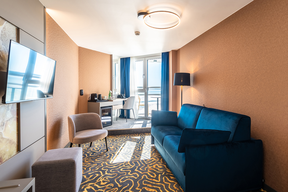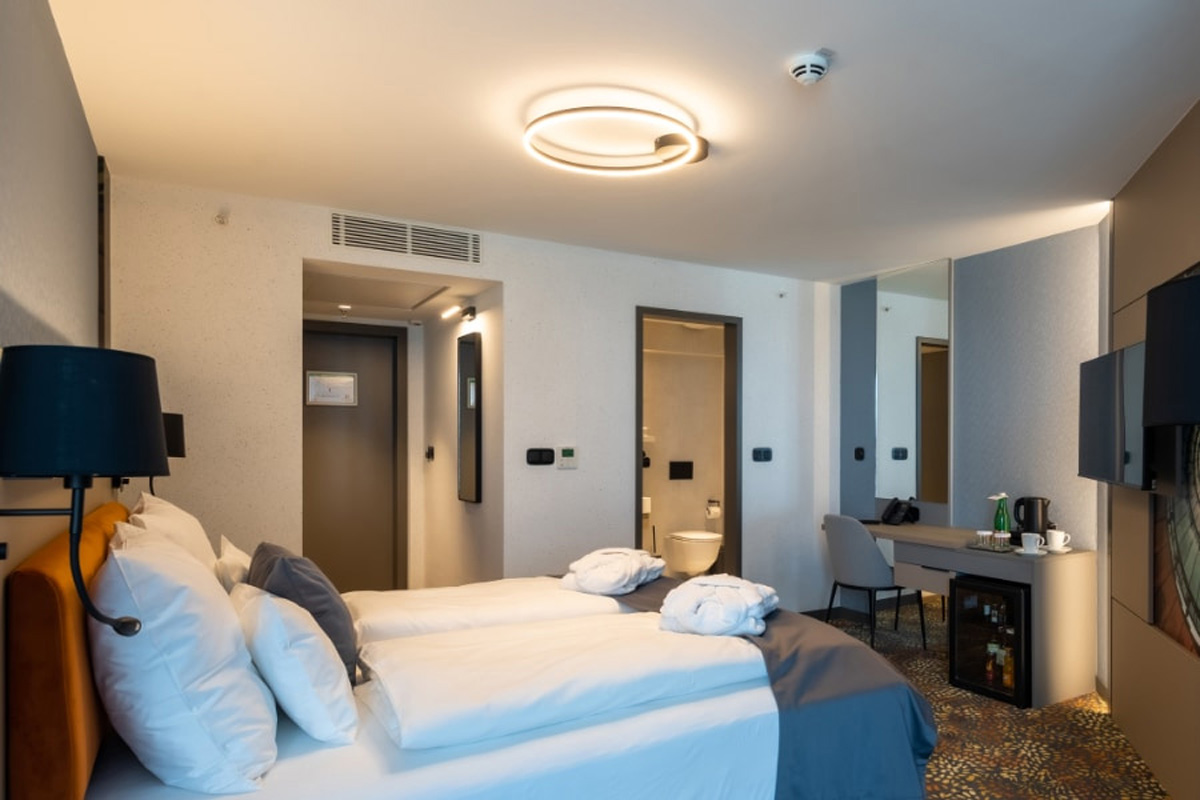individuálně nastavitelná klimatizace, trezor, minibar*, set s rychlovarnou konvicí na přípravu kávy/čaje, župan, fén, pantofle, lázeňská taška s ručníkem do wellness, exkluzivní kosmetika, smart TV, wifi, telefon