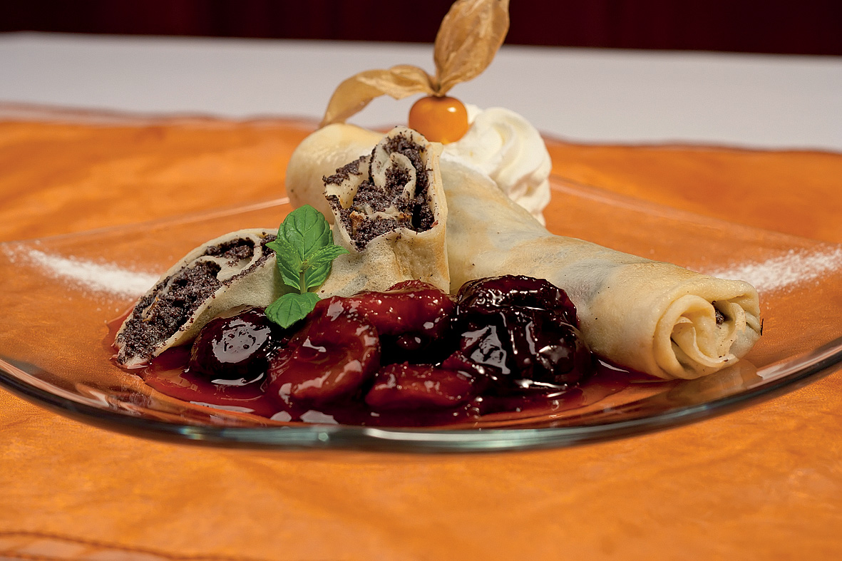 mezinárodní bufet (polévka, hlavní chod a dezert); nápoje za poplatek