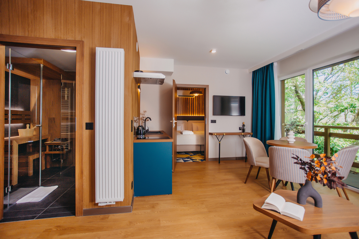 33–38 m² – ložnice s manželskou postelí či 2 samostatnými lůžky, obývací pokoj s rozkládacím gaučem pro 2 osoby, kuchyňský kout, koupelna s vlastní saunou, balkon