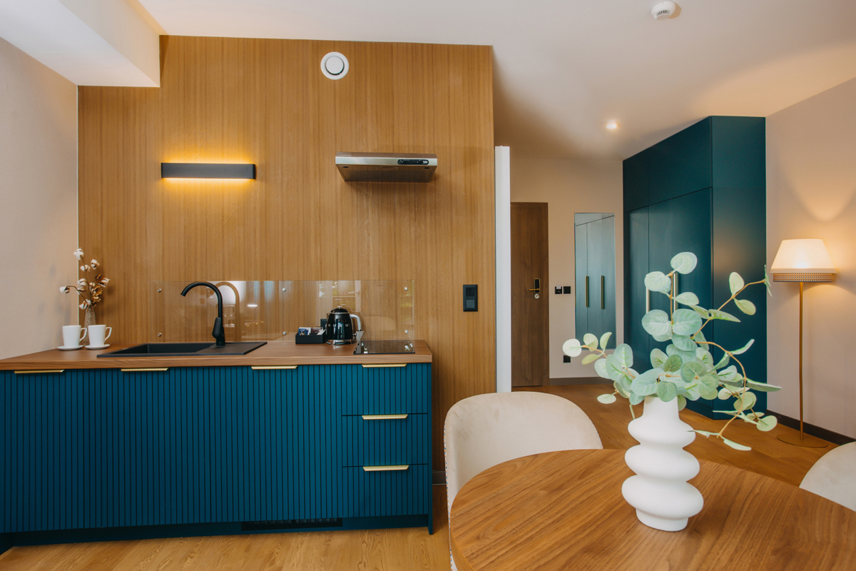 klimatizace, TV sat., telefon, fén, lednička, rychlovarná konvice, minibar (pouze v typologii Deluxe 2/3/4), set na kávu a čaj, kuchyňský kout s varnou deskou a nádobím, župany do wellness, kosmetický set, wi-fi připojení k internetu