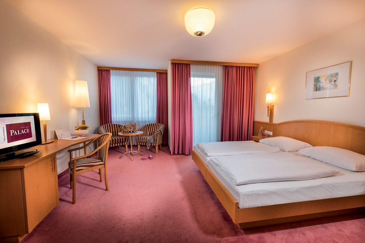 18 m² - jednodušeji zařízený pokoj s manželskou postelí (šíře 160 x 200 cm), sociální zařízení se sprchou či vanou, balkon; infant nad rámec maximální obsazenosti pokoje není povolen!