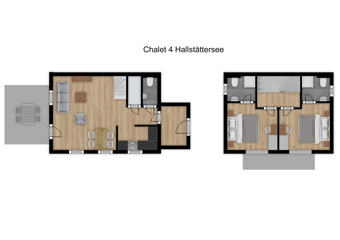 65 m² - 1. podlaží chaletu: obývací pokoj s kuchyňským a jídelním koutem, gauč, samostatné WC, terasa; 2. podlaží chaletu: 2 ložnice s manželskou postelí či 2 samostatnými lůžky, 2x sociální zařízení se sprchou (vstup vždy z ložnice), balkon