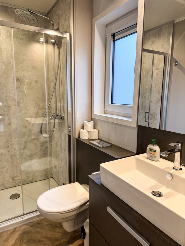 32 m² - ložnice s manželskou postelí, ložnice se 2 samostatnými lůžky, obývací pokoj s kuchyňským koutem, sociální zařízení se sprchou, místnost na úschovu kol, terasa