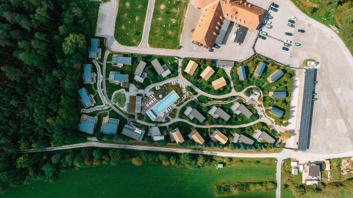 prázdninová vesnička s chalety v těsné blízkosti jezera