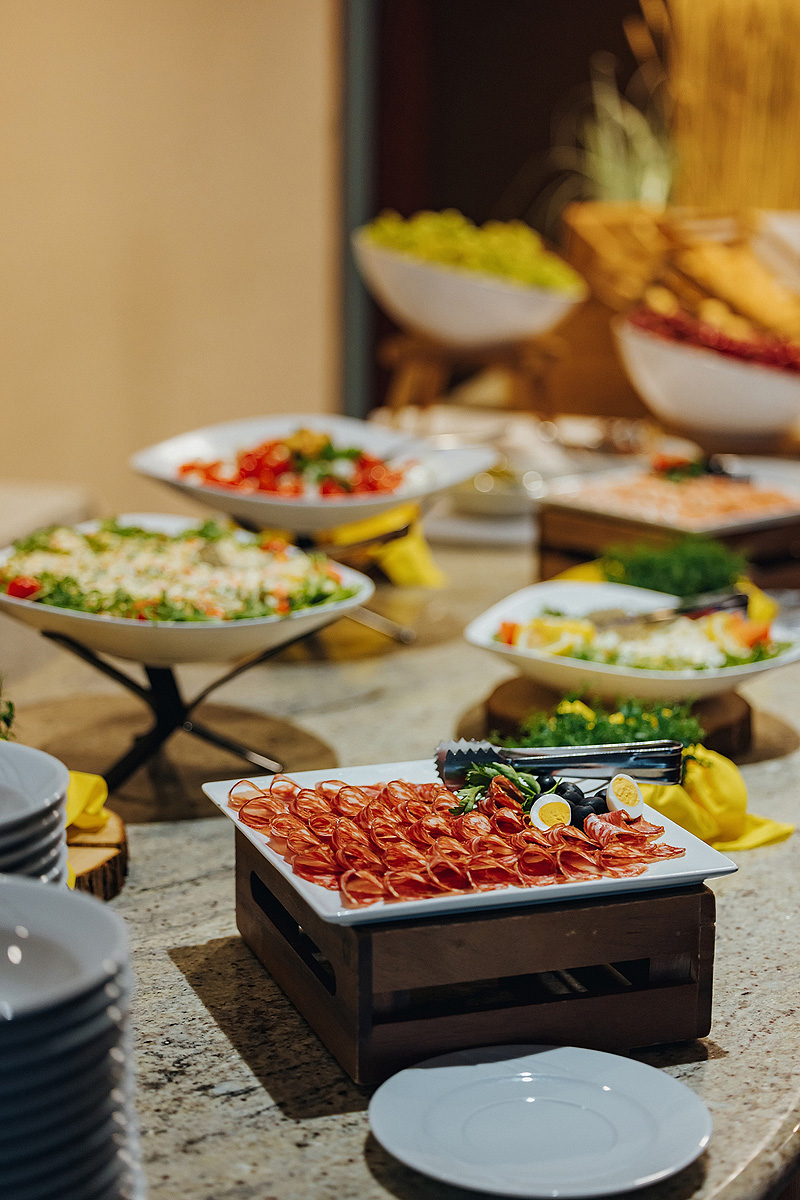 fakultativně za poplatek - formou mezinárodního bufetu v hotelové restauraci, nápoje za poplatek; nutné předem objednat