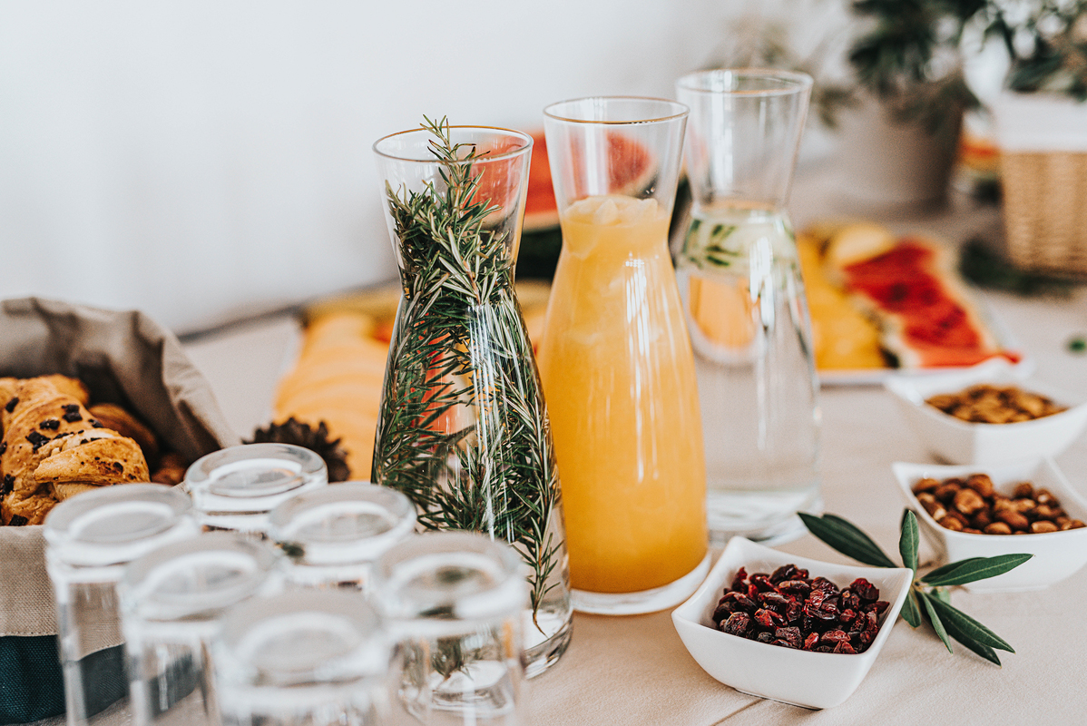 formou bufetu, nápoje zahrnuty v ceně – voda, minerální voda, džusy, točené místní bílé a červené víno, točené místní pivo