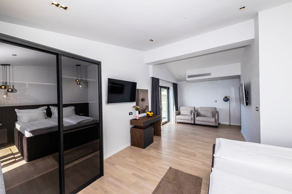 24 m² - pokoj s manželskou postelí a přistýlkou formou rozkládacího gauče, sociální zařízení se sprchou, balkon orientovaný na mořskou stranu