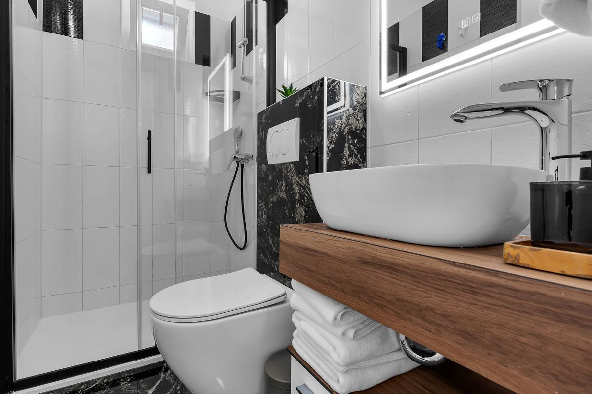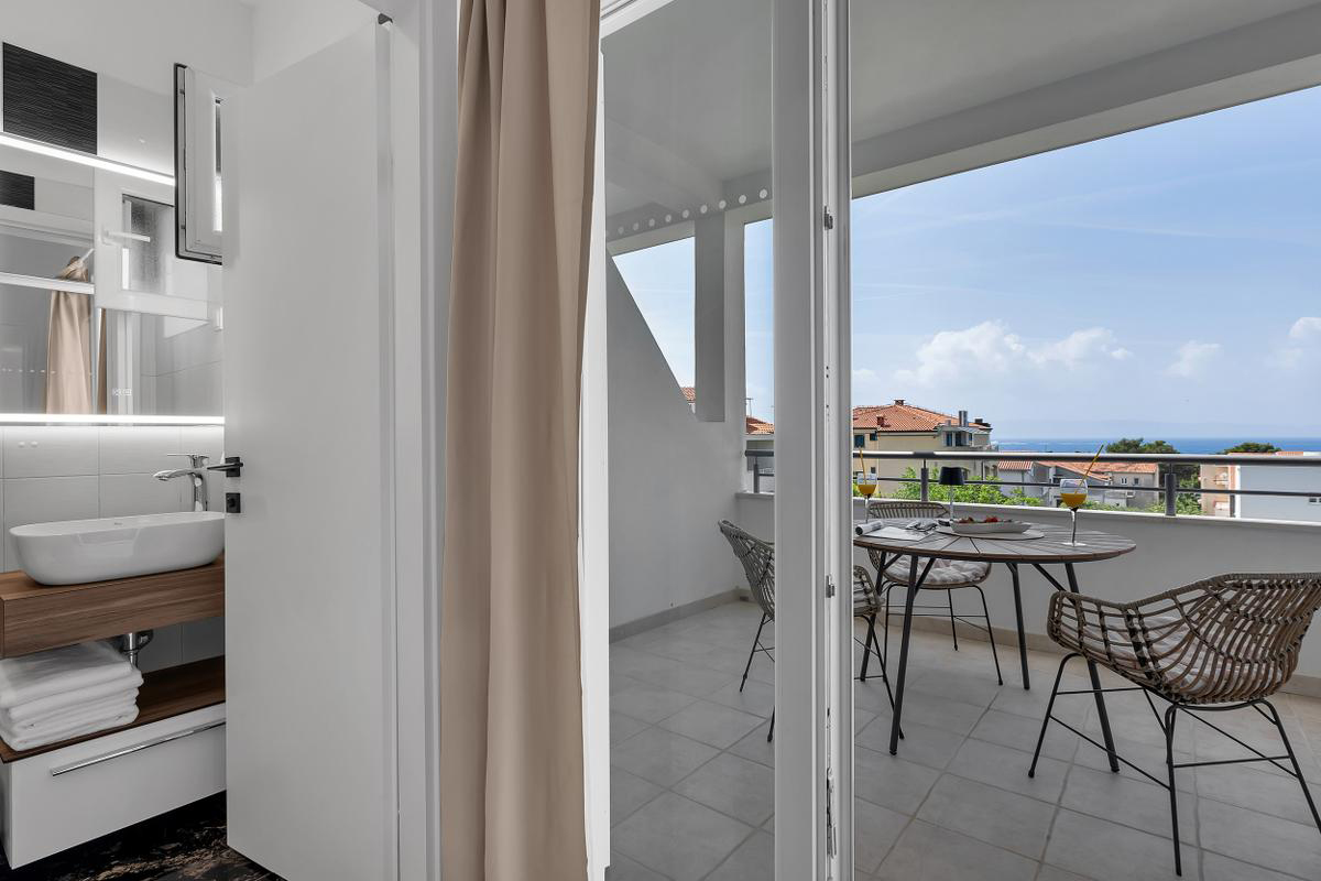 apartmán s manželskou postelí, obývací pokoj s vybaveným kuchyňským koutem, s možností přistýlky formou rozkládacího gauče pro dítě do nedovršených 16 let, sociální zařízení se sprchou, balkon orientovaný na mořskou stranu