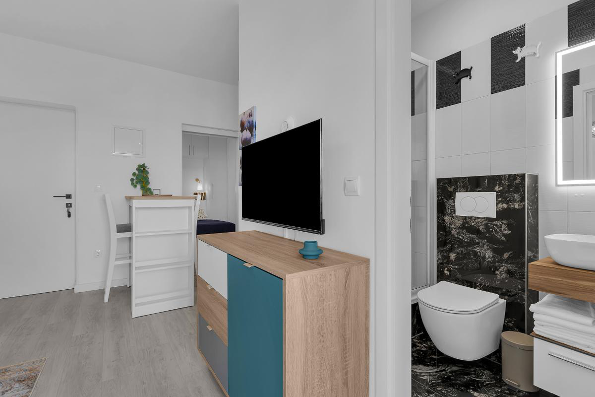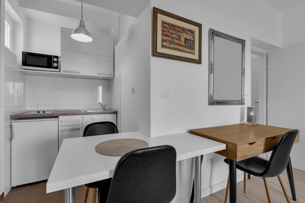 studio s manželskou postelí a vybaveným kuchyňským koutem, s možností přistýlky formou rozkládacího gauče pro dítě do nedovršených 16 let, sociální zařízení se sprchou, balkon orientovaný na mořskou stranu
