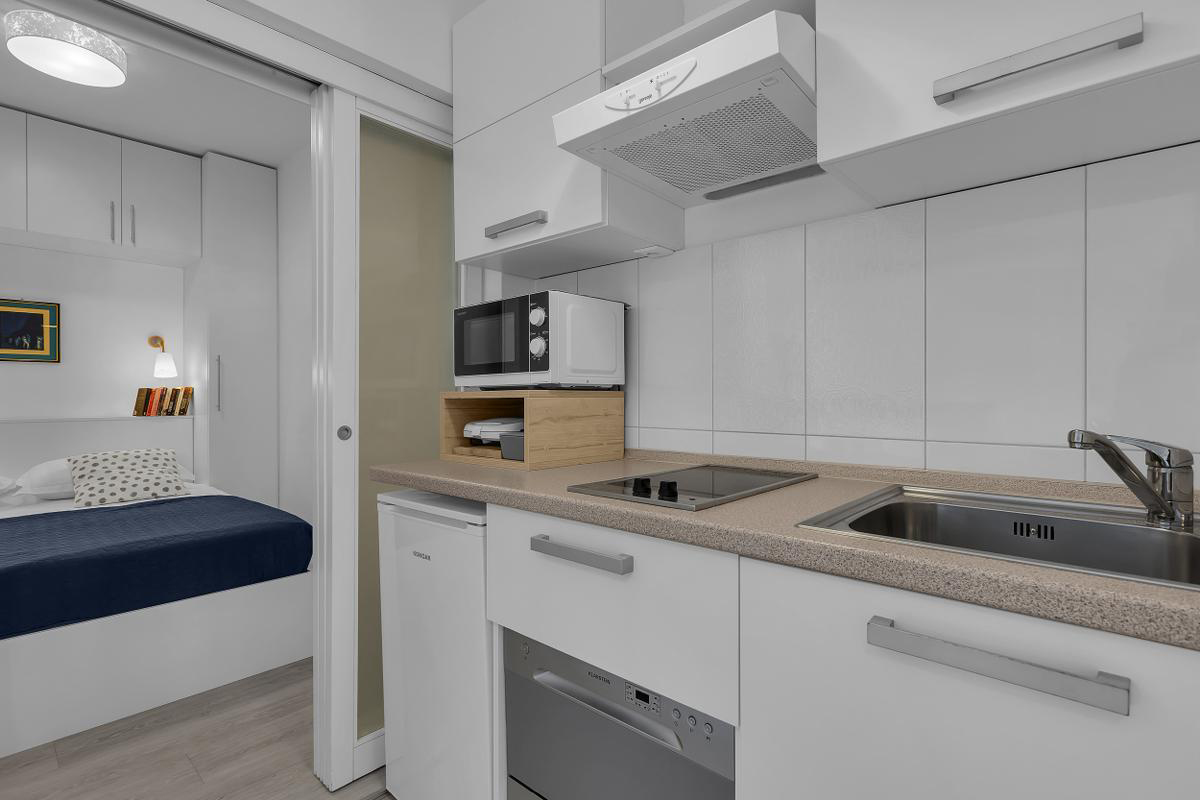studio s manželskou postelí a vybaveným kuchyňským koutem, sociální zařízení, balkon orientovaný na pohoří Biokovo