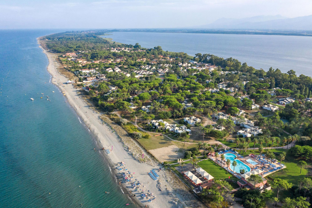 komplex několika přízemních či patrových domků v borovicovém háji, hlavní budova s restaurací, zázemí pro animační programy; resort se nachází na úzkém pruhu pevniny mezi mořem a unikátní lagunou