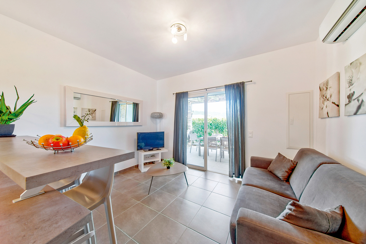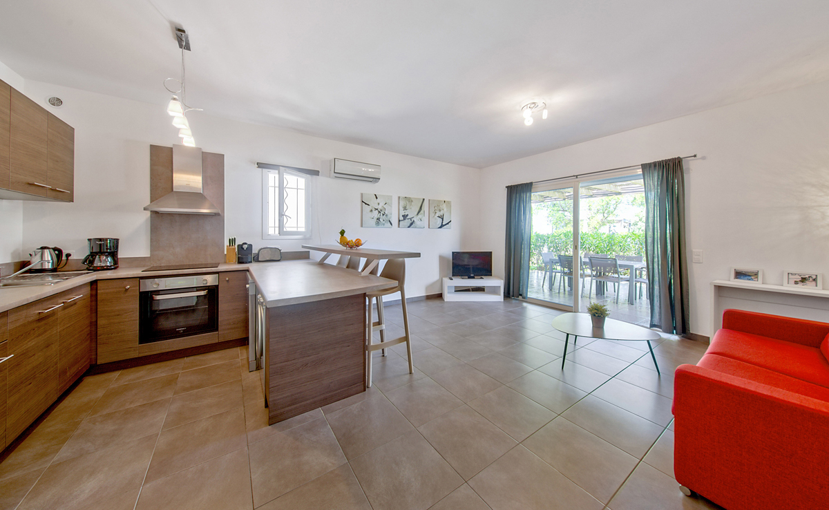 50 m² - 1 ložnice s manželskou postelí, obývací pokoj s kuchyňským koutem a rozkládacím gaučem pro 2 osoby (možno i typ "šuplík"), sociální zařízení se sprchou, prostorná terasa (30 m²) s grilem a s výhledem na bazén
