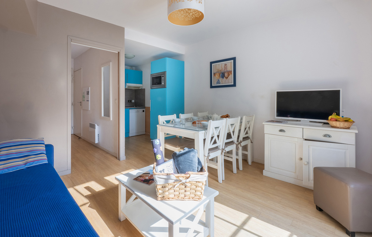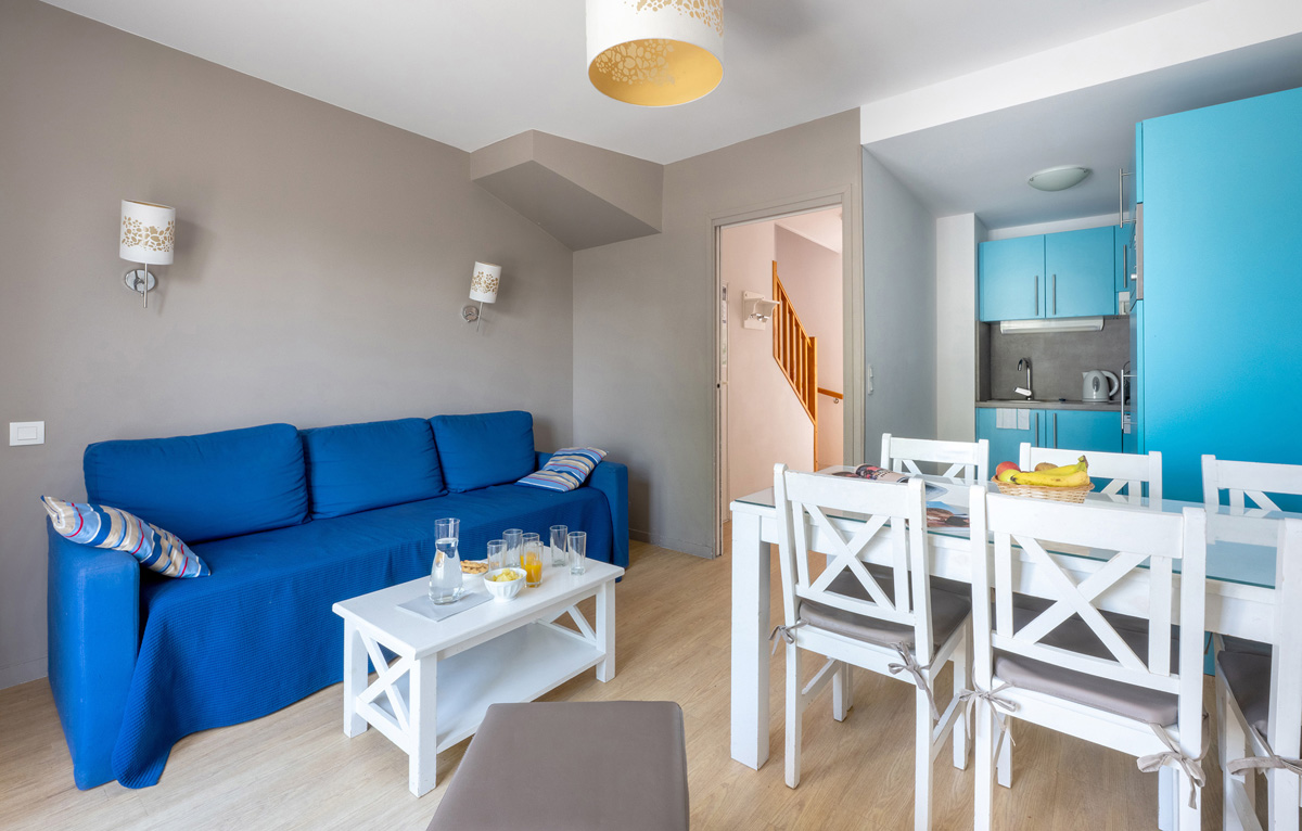 34 m² - 1 ložnice s manželskou postelí či s oddělitelnými lůžky, obývací pokoj s kuchyňským koutem a rozkládacím gaučem pro 2 osoby (možno i typ "šuplík"), sociální zařízení se sprchou, terasa či balkon