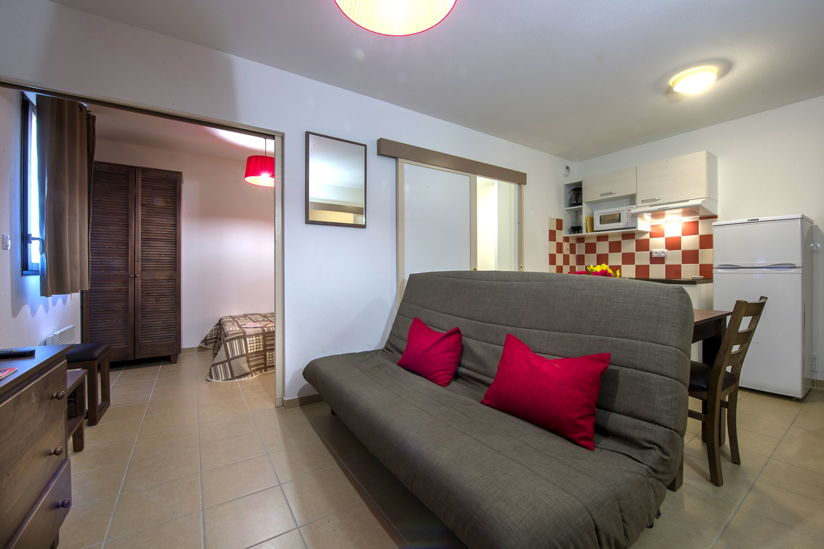 27 m² - 1 ložnice s manželskou postelí, obývací pokoj s kuchyňským koutem a rozkládacím gaučem pro 2 osoby, koupelna s vanou a WC, terasa či balkon