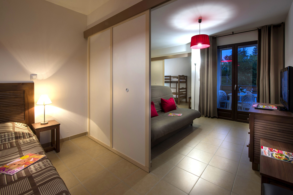 35 m² - 1 ložnice s manželskou postelí, kabina s palandou, obývací pokoj s kuchyňským koutem a rozkládacím gaučem pro 2 osoby, koupelna s vanou a WC, terasa či balkon s posezením