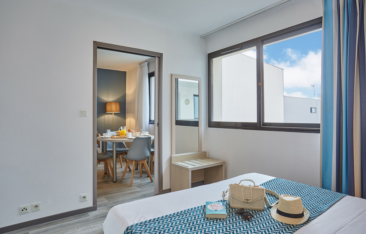 56 m² - 1 ložnice s manželskou postelí, kabina s palandou, obývací pokoj s kuchyňským koutem a rozkládacím gaučem pro 2 osoby (možno i typ "šuplík"), sociální zařízení se sprchou či vanou, balkon či terasa s posezením; některé apartmány mohou být dvoupodlažní