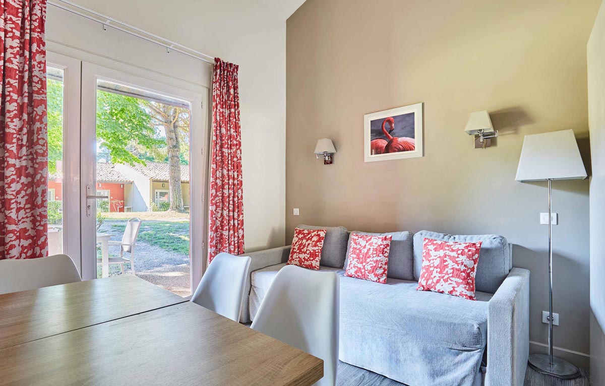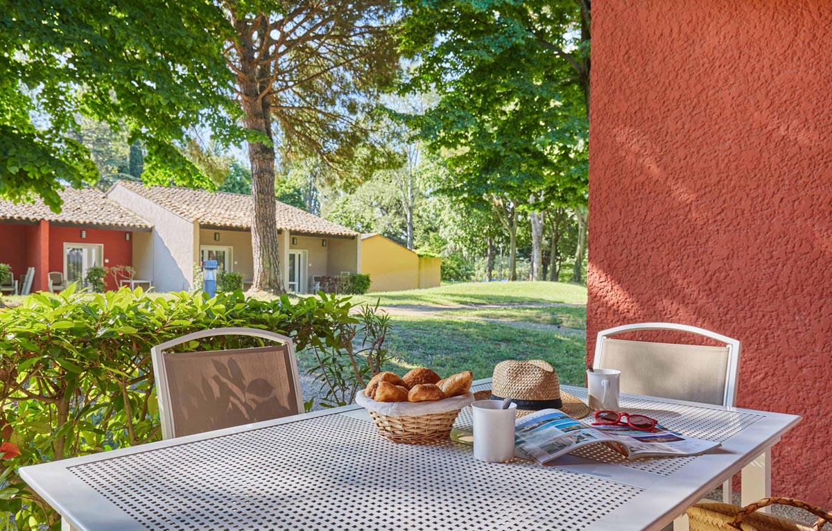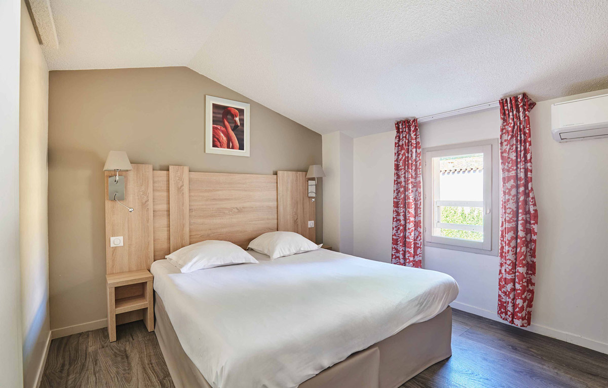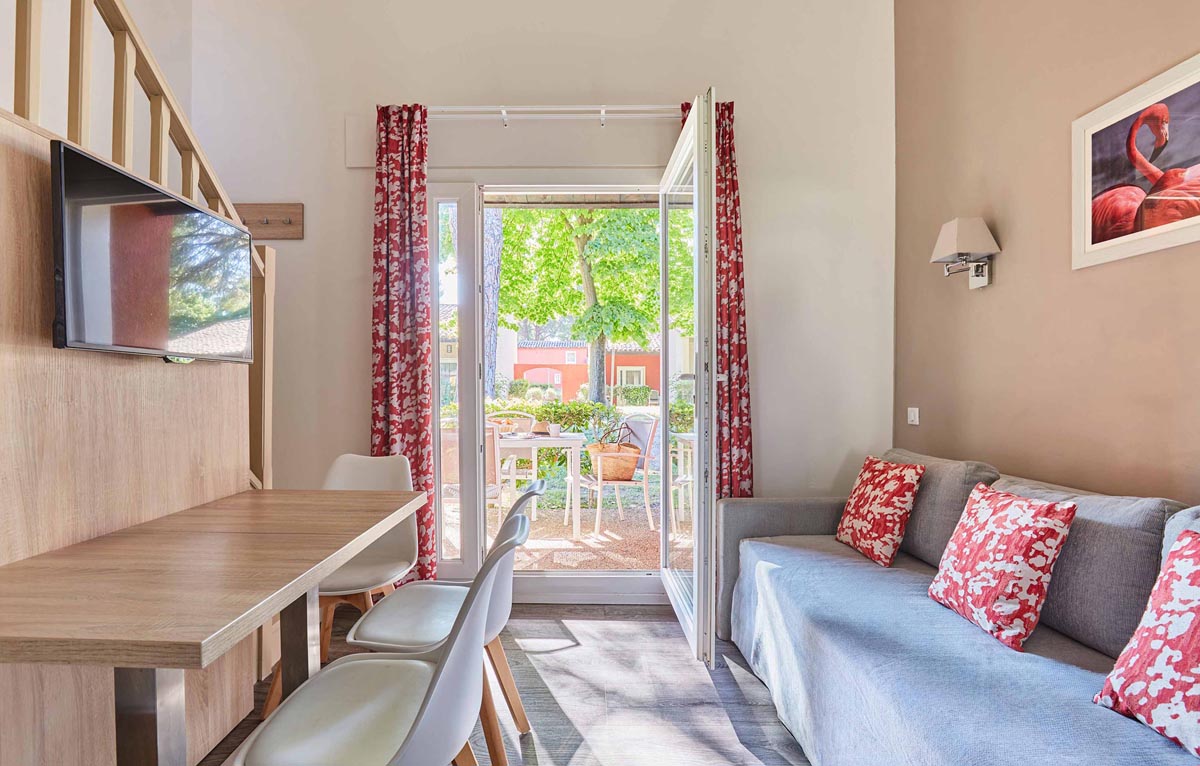 residence sestávající se z menších provensálských řadových domků obklopených bohatou zelení v rámci prázdninového residenčního komplexu 35 ha Le Village Camarguais, klimatizované nadstandardní apartmány vždy s terasou