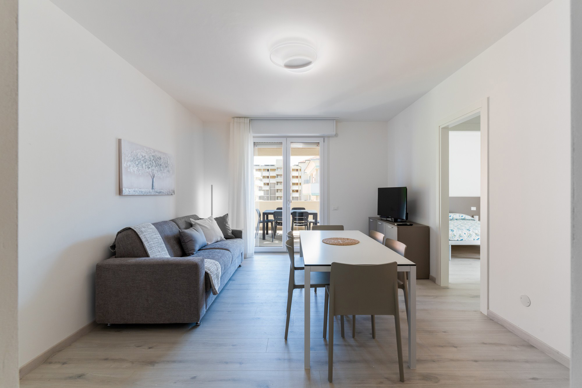 35 m² - 1 ložnice s manželskou postelí a případně 1 samostatným lůžkem, obývací pokoj s kuchyňským koutem a rozkládacím gaučem pro 2 osoby, sociální zařízení se sprchou, balkon; bilo 5+ zrekonstruované