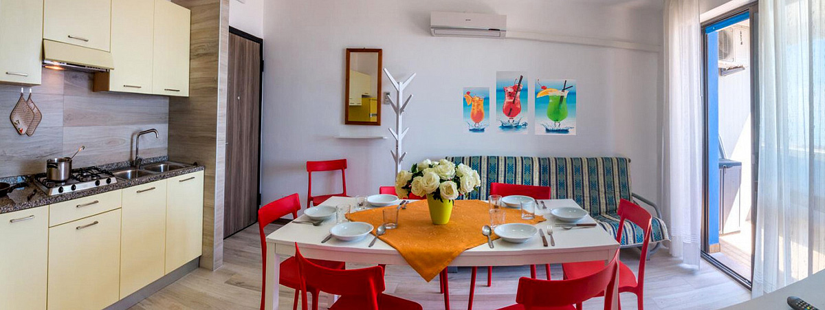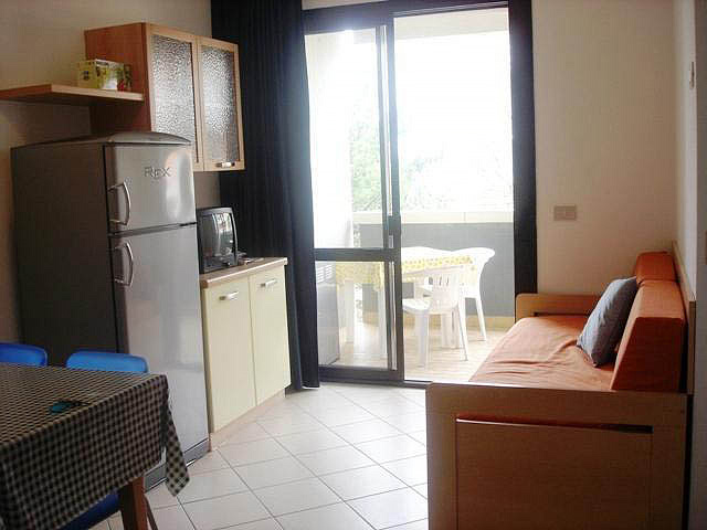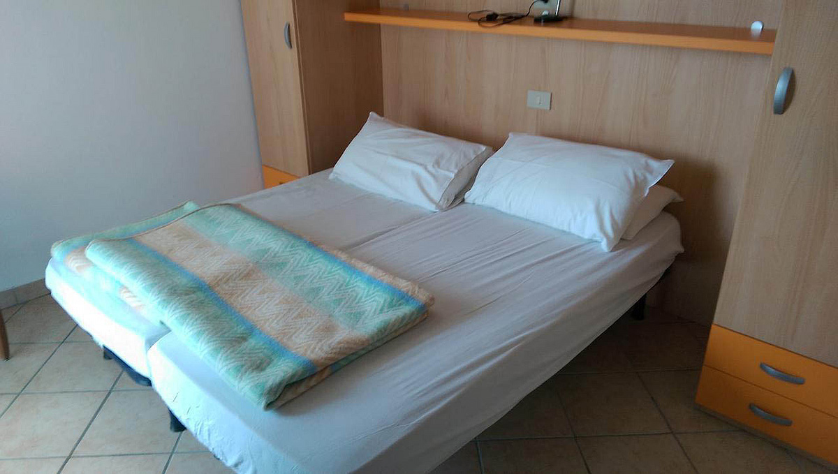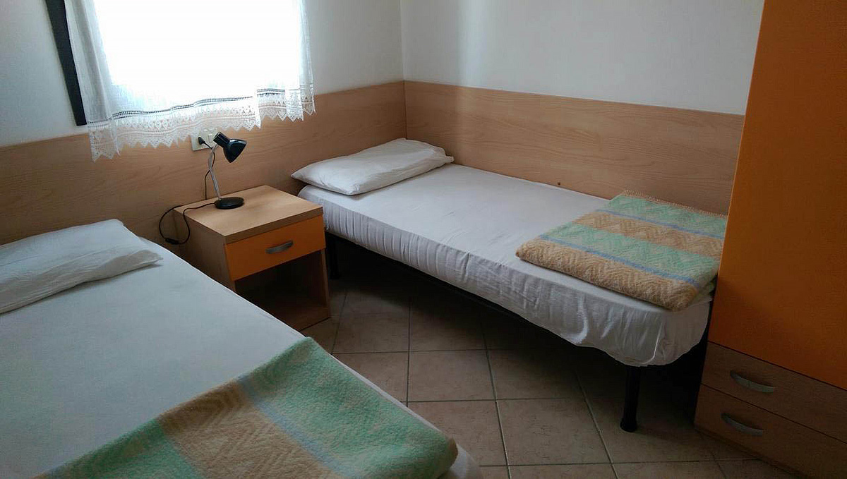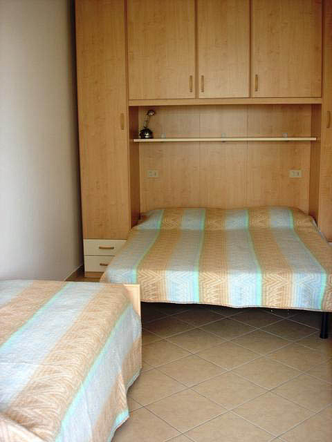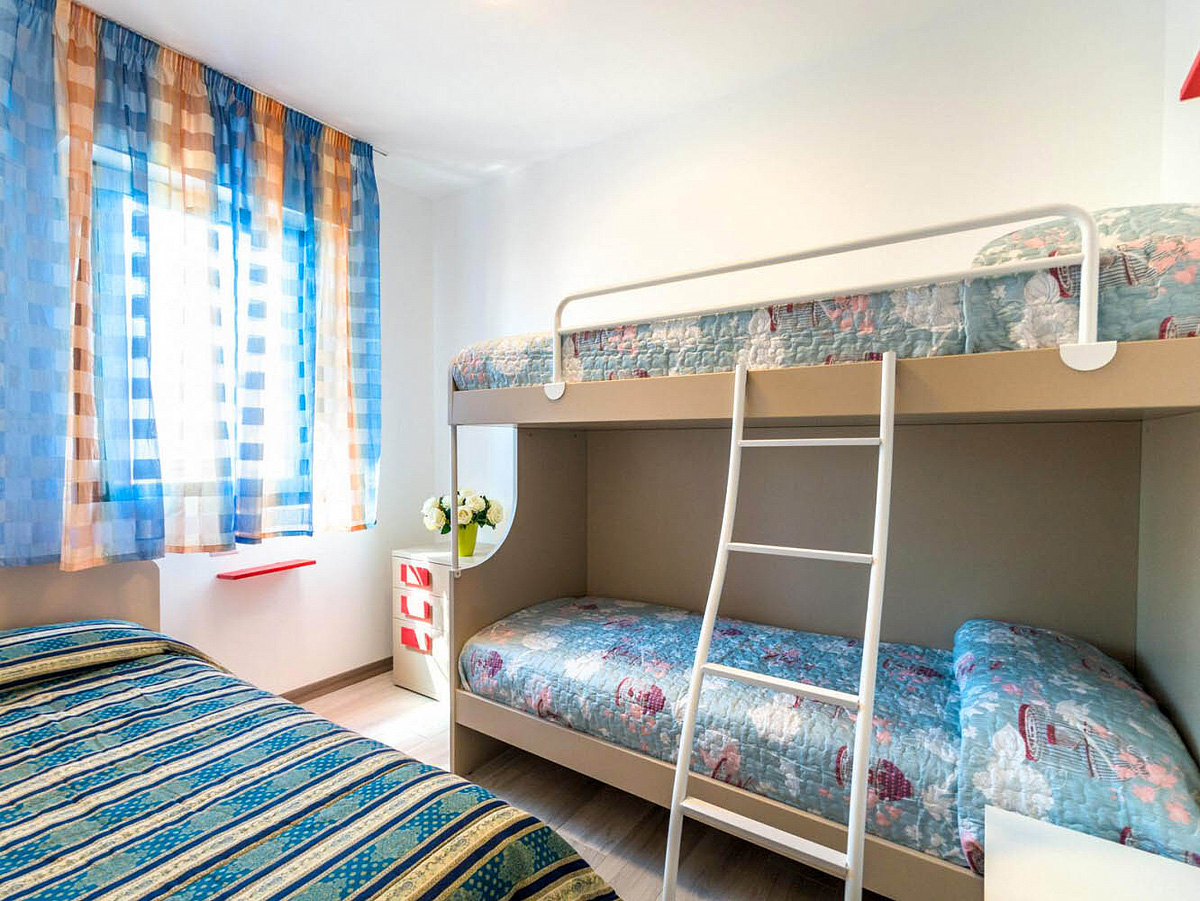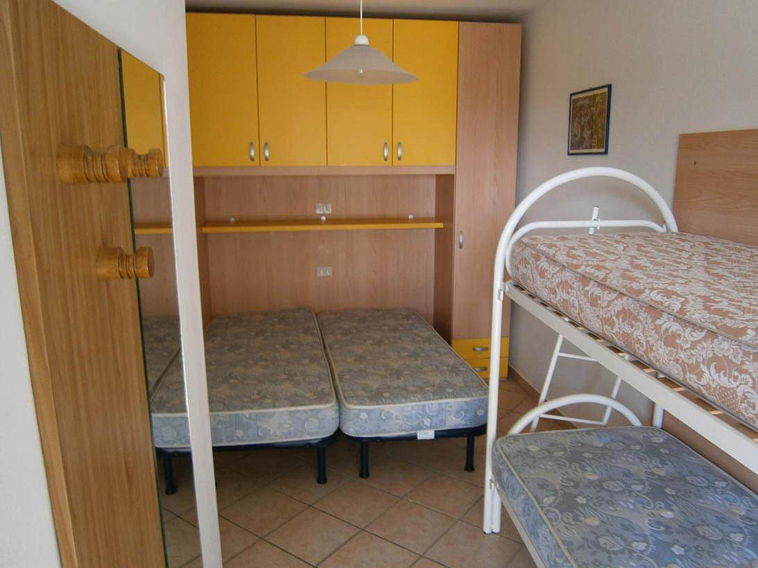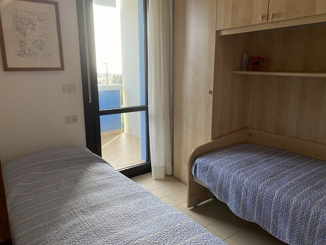 trilo 5/6 / trilo 5/6° - 43 m² - 1 ložnice s manželskou postelí a případně 1 samostatným lůžkem, 1 ložnice se 2 samostatnými lůžky či 1 samostatným lůžkem a palandou, obývací pokoj s kuchyňským koutem a gaučem pro 1 případně 2 osoby (možno typ „šuplík“), sociální zařízení se sprchou, balkon; typ trilo 5/6° s výhledem na moře