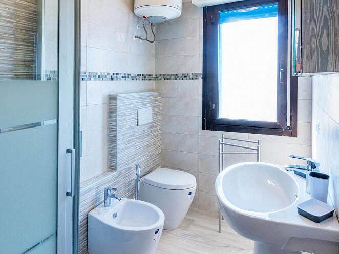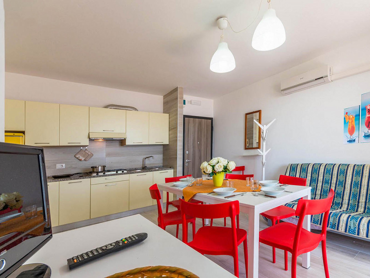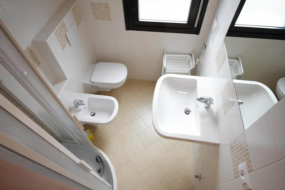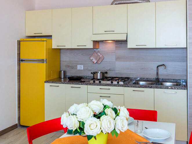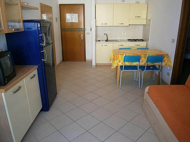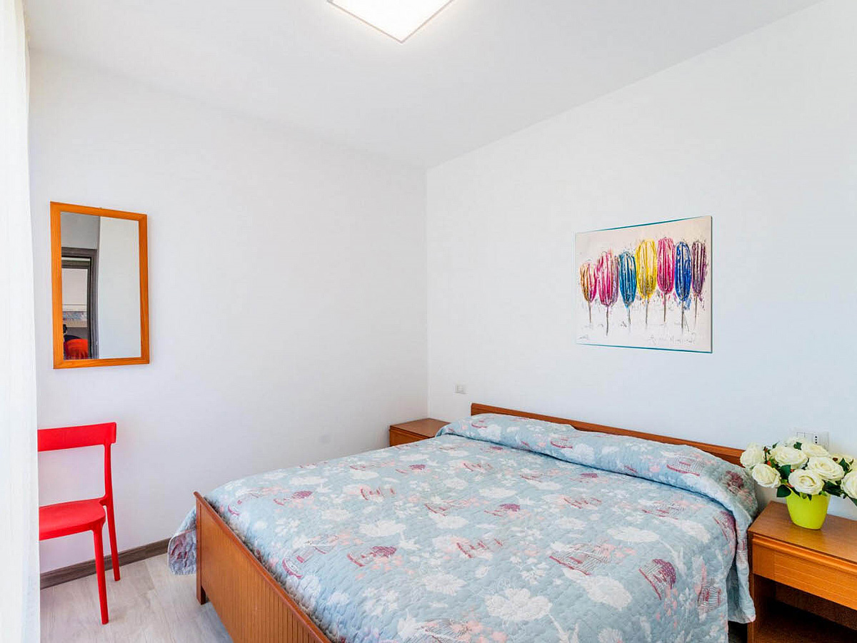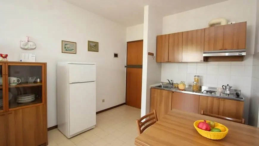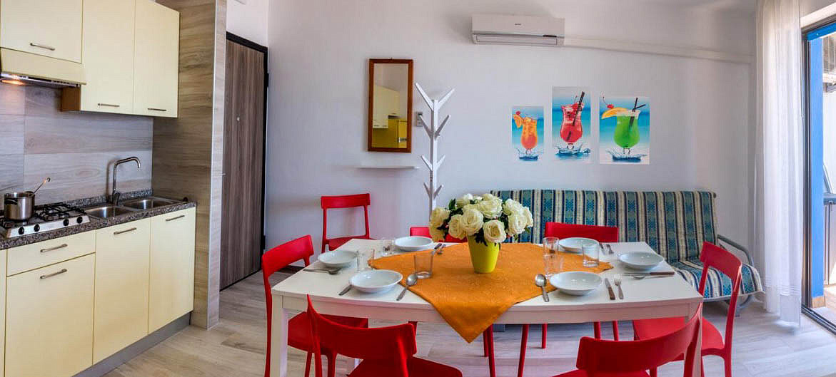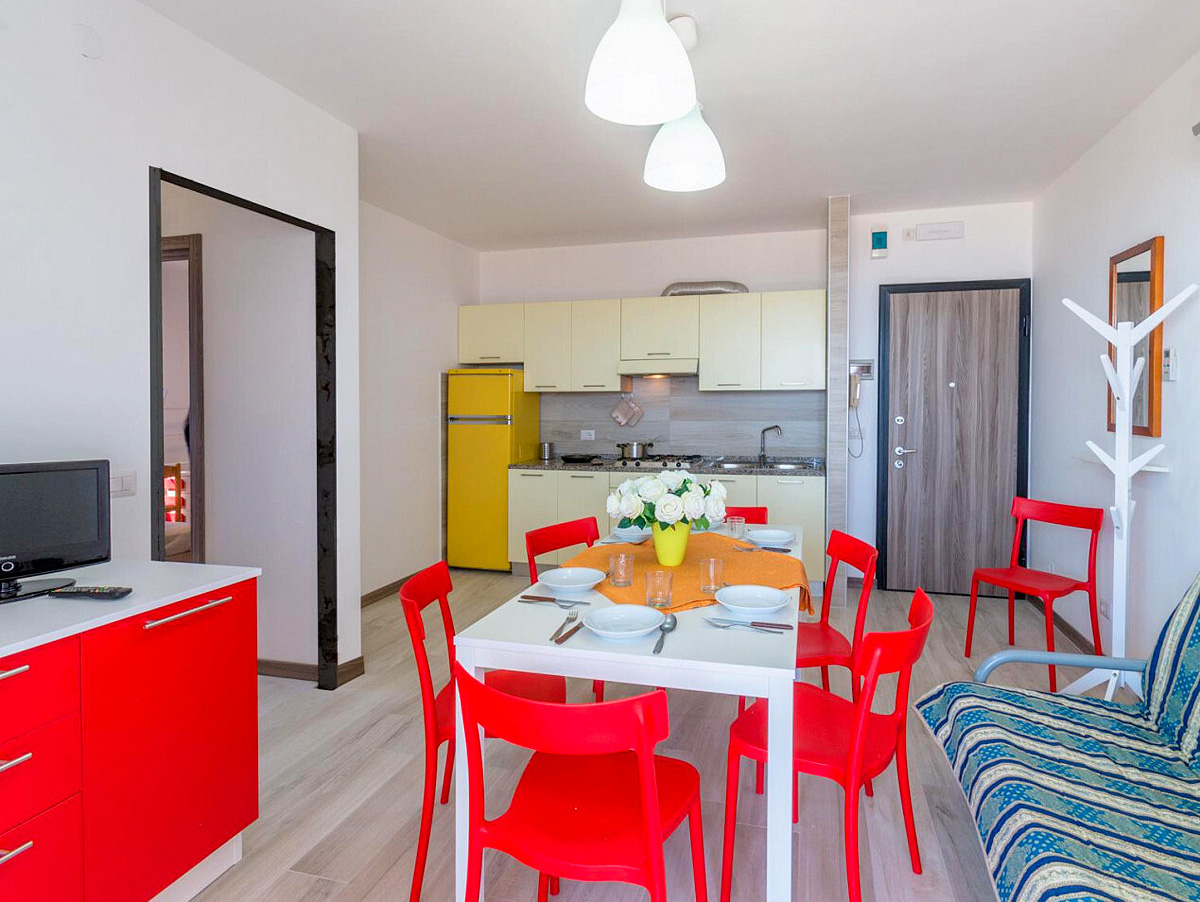 trilo 5/6 / trilo 5/6° - 43 m² - 1 ložnice s manželskou postelí a případně 1 samostatným lůžkem, 1 ložnice se 2 samostatnými lůžky či 1 samostatným lůžkem a palandou, obývací pokoj s kuchyňským koutem a gaučem pro 1 případně 2 osoby (možno typ „šuplík“), sociální zařízení se sprchou, balkon; typ trilo 5/6° s výhledem na moře