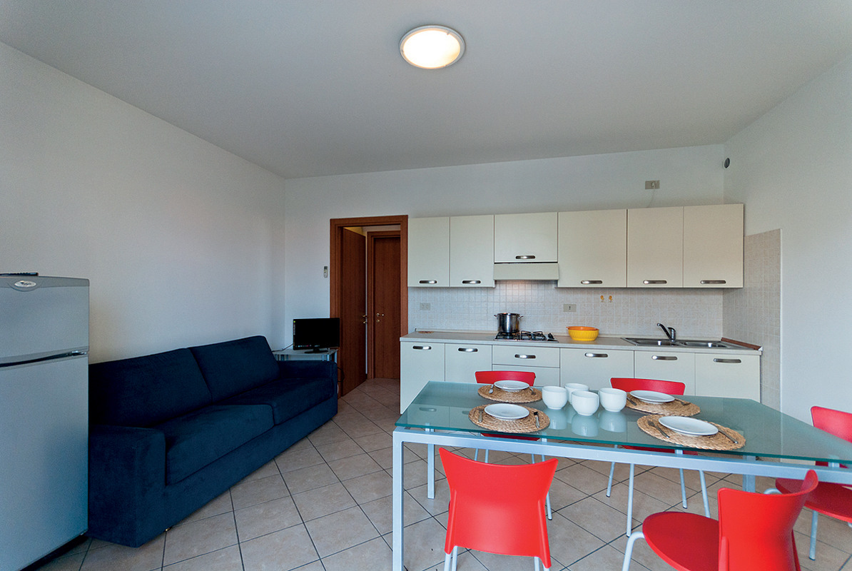 1 ložnice s manželskou postelí, 1 ložnice s palandou pro 2 osoby, obývací pokoj s kuchyňským koutem a rozkládacím gaučem pro 2 osoby, sociální zařízení se sprchovým koutem, terasa