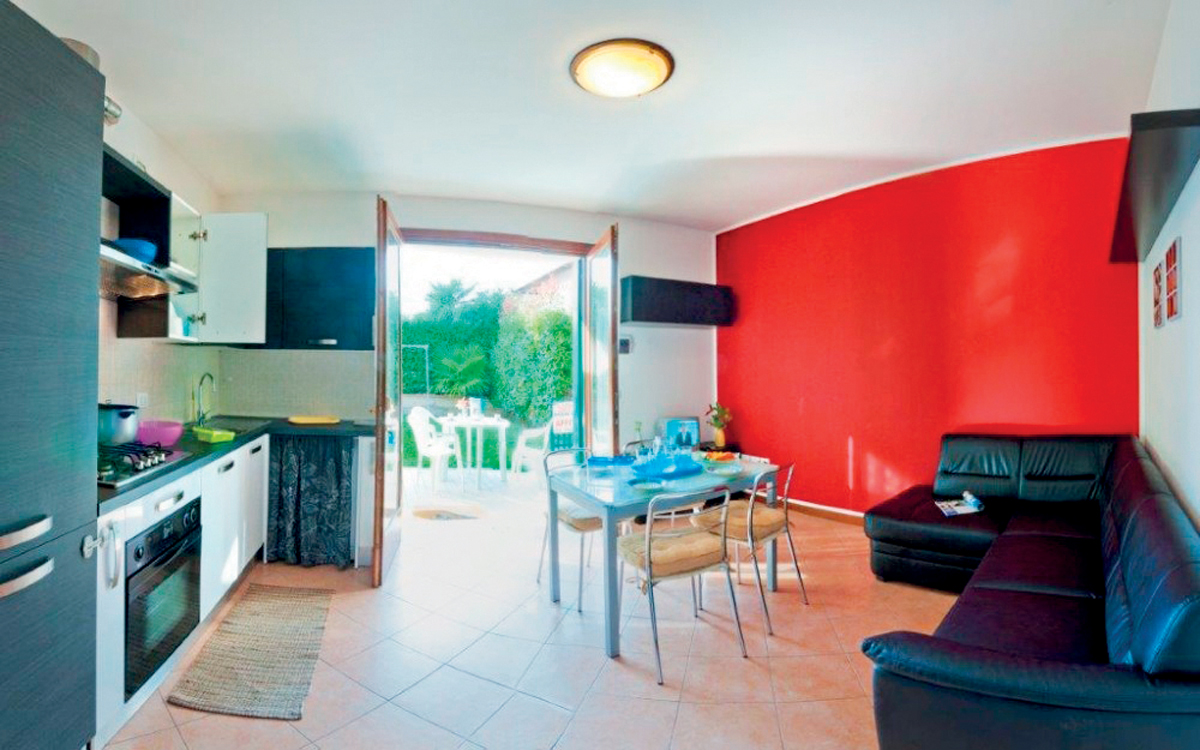 1 ložnice s manželskou postelí a 1 vyvýšeným lůžkem, obývací pokoj s kuchyňským koutem, rozkládacím gaučem pro 2 osoby, sociální zařízení se sprchovým koutem, terasa nebo předzahrádka