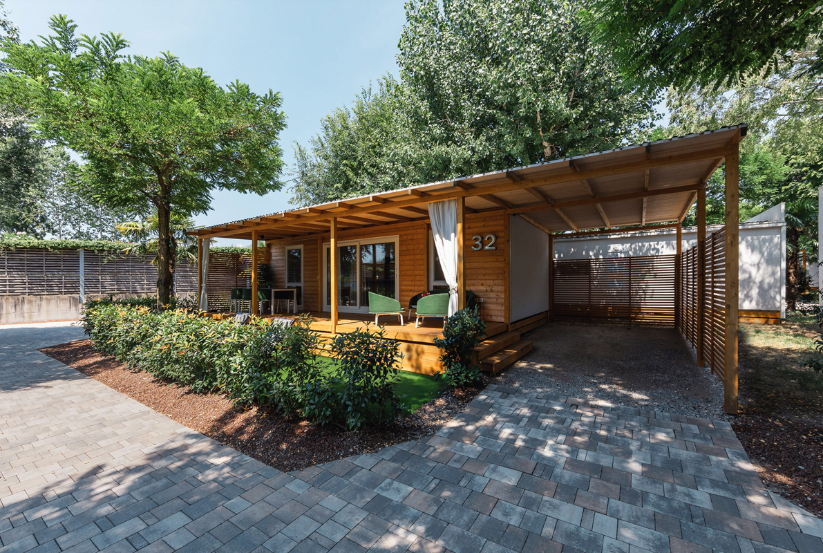 33 m² - ložnice s manželskou postelí, ložnice se 2 samostatnými lůžky a zavěšeným lůžkem (pro dítě do nedovršených 10 let), obytná část s kuchyňským koutem, 2 sociální zařízení se sprchou, krytá uzavíratelná terasa se zahradním nábytkem
