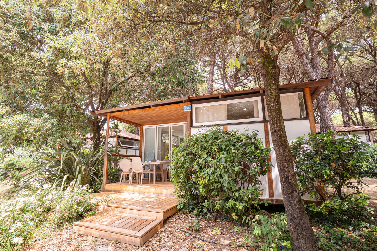 25 m² - ložnice s manželskou postelí, ložnice se 2 samostatnými lůžky a zavěšeným lůžkem (pro dítě do nedovršených 10 let), obytná část s kuchyňským koutem, sociální zařízení se sprchou, krytá uzavřená terasa