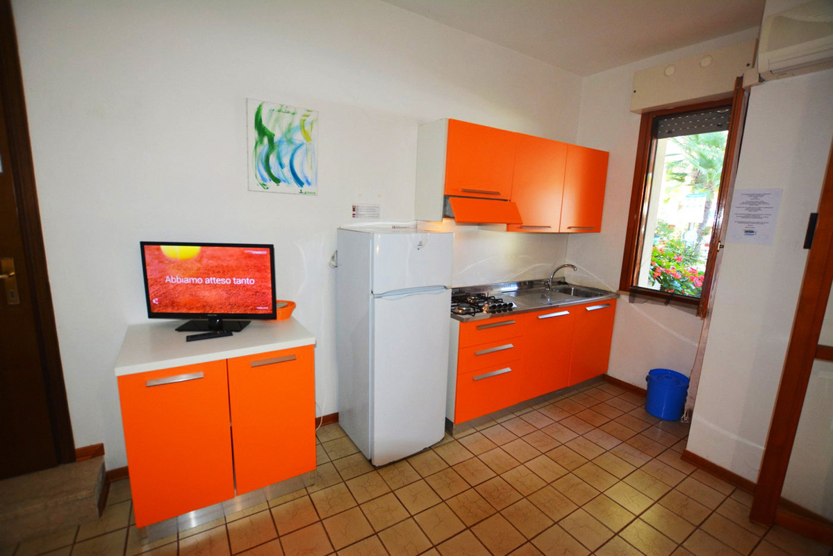 obývací pokoj s kuchyňským koutem, 1 manželskou postelí či 1 samostatným sklápěcím lůžkem a rozkládacím gaučem pro 2 osoby, sociální zařízení se sprchovým koutem, terasa