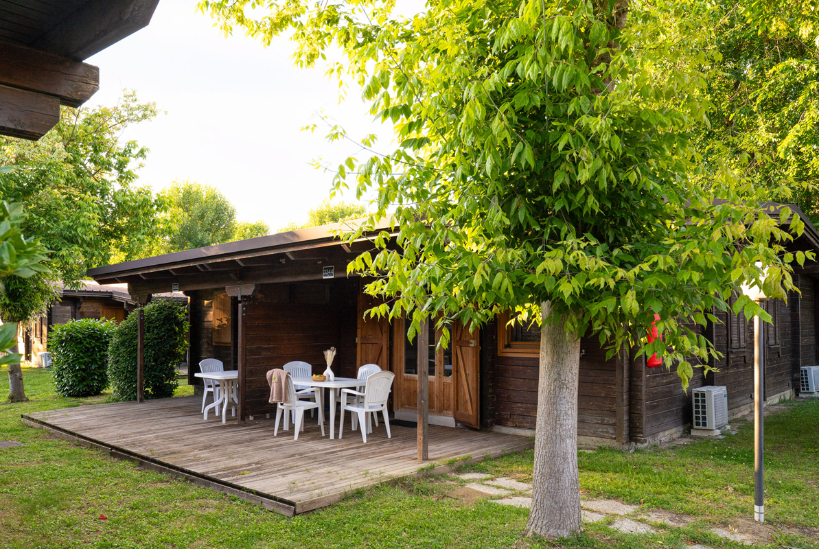 27 m² – ložnice s manželskou postelí, obytná část s kuchyňským koutem a rozkládacím gaučem pro 2 děti do nedovršených 10 let, sociální zařízení se sprchou, krytá dřevěná terasa