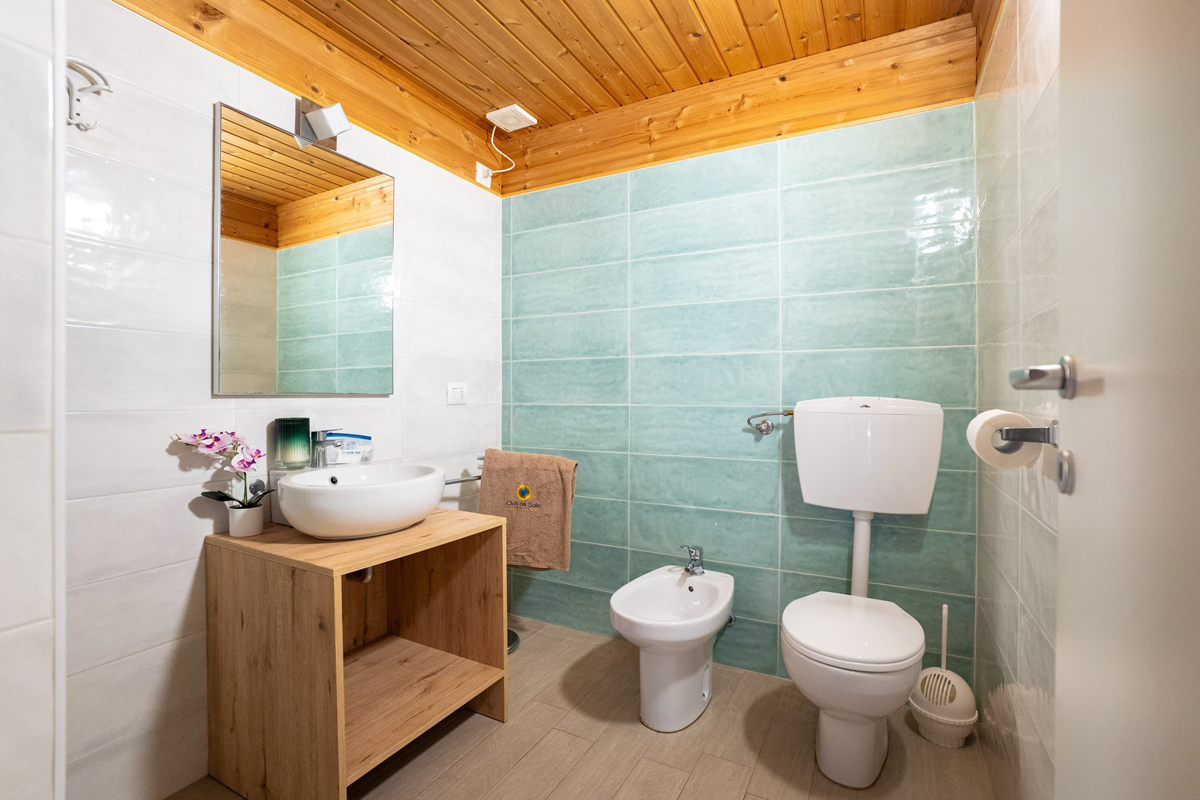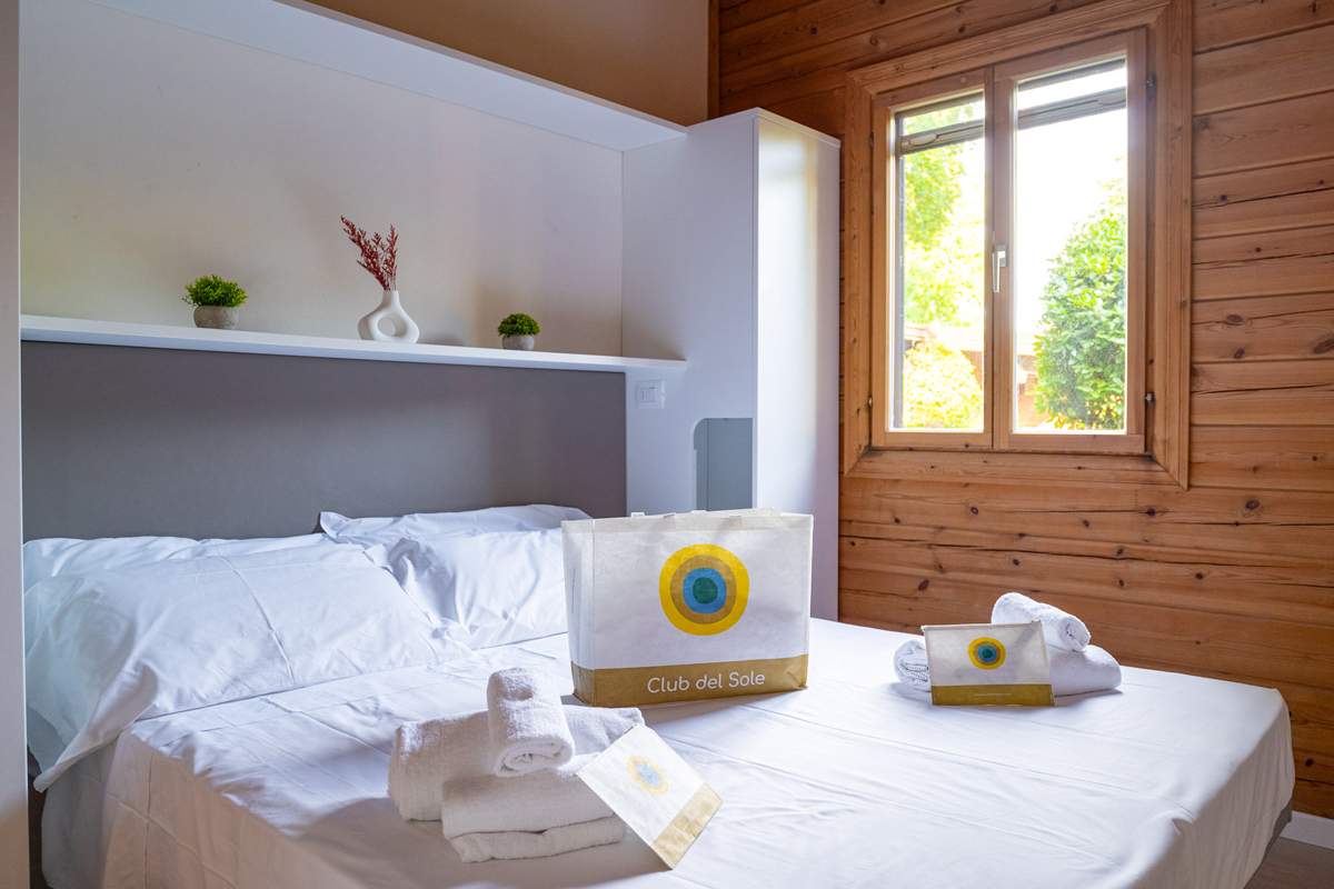 32 m² – ložnice s manželskou postelí, ložnice s 2 samostatnýma lůžky, obytná část s kuchyňským koutem a rozkládacím gaučem 2 osoby, 2 sociální zařízení se sprchou, krytá dřevěná terasa