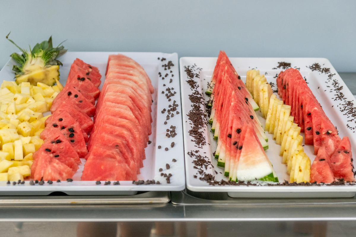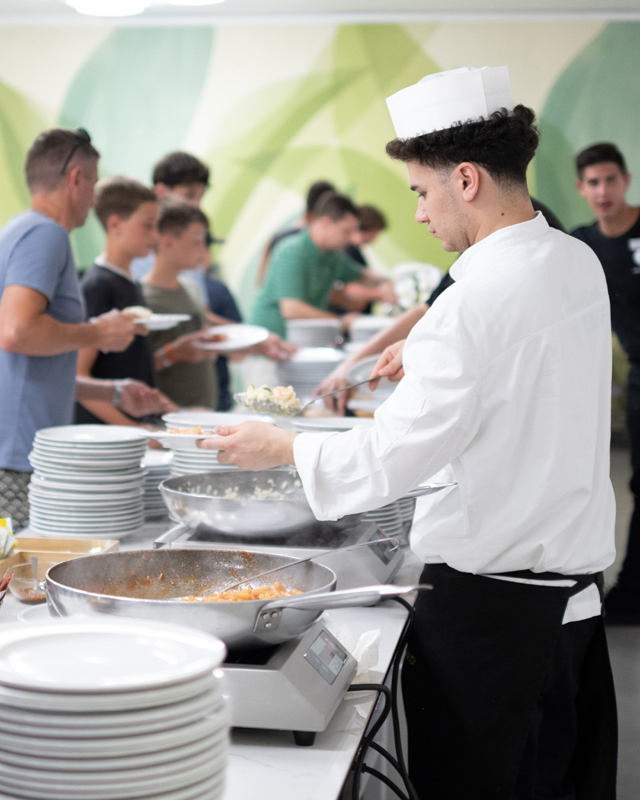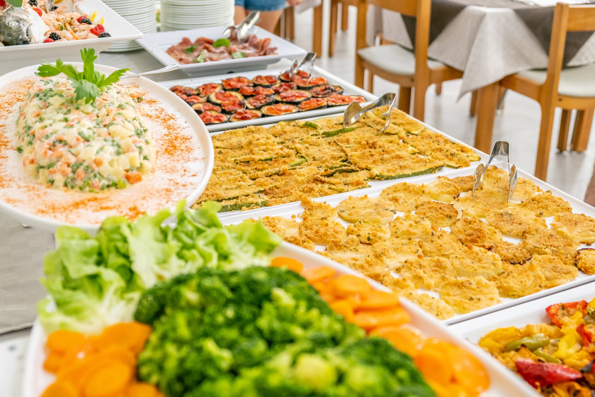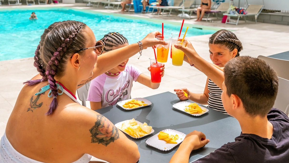 open bar - po celý den (08:00-23:00) k dispozici čepované nápoje (voda, nealko, pivo, káva), vybrané místní likéry a pálenky; odpolední drobné občerstvení v baru u bazénu
