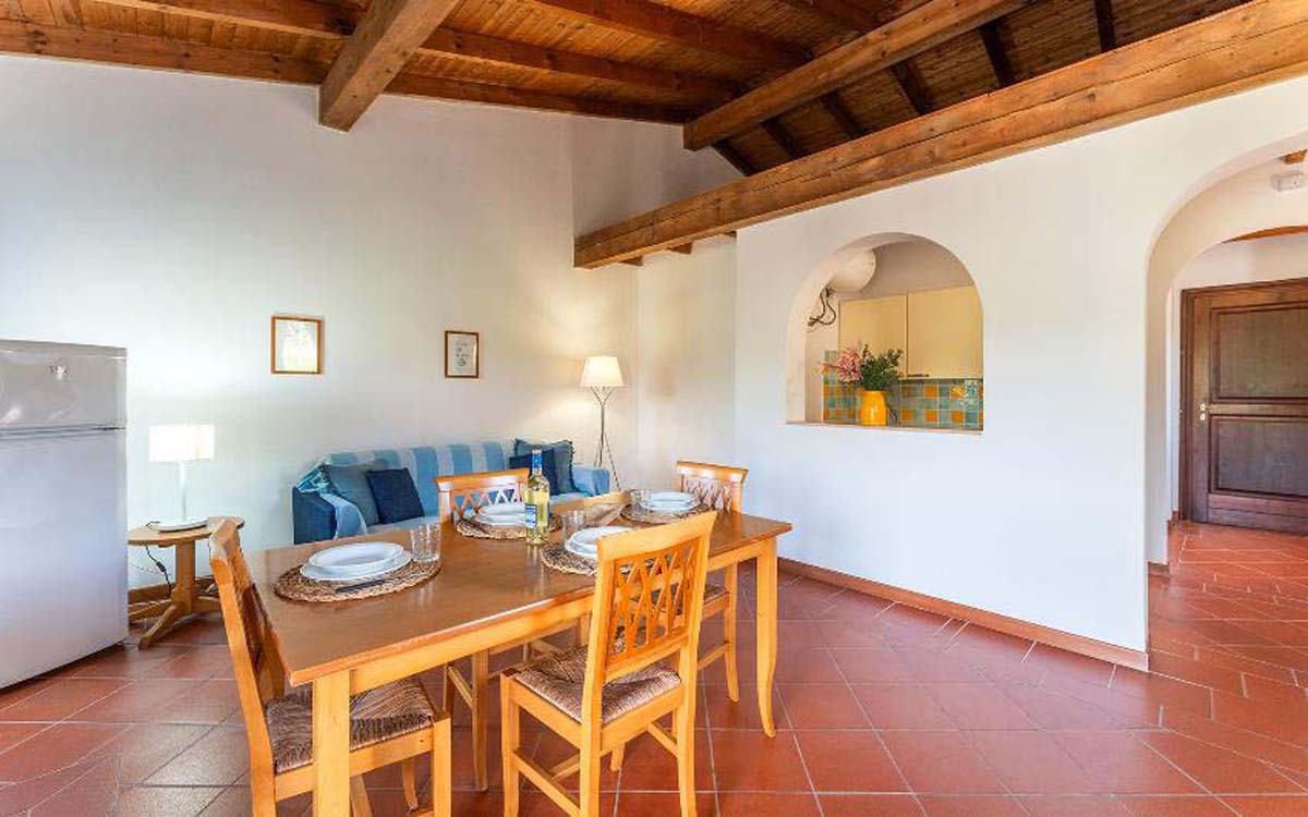 60 m² - 1 ložnice s manželskou postelí, obývací pokoj s kuchyňským koutem a rozkládacím gaučem pro 2 osoby, sociální zařízení se sprchou či vanou, balkon nebo terasa; sdílený bazén; možnost 5. lůžka na vyžádání za poplatek 15 € / noc (platba na místě)