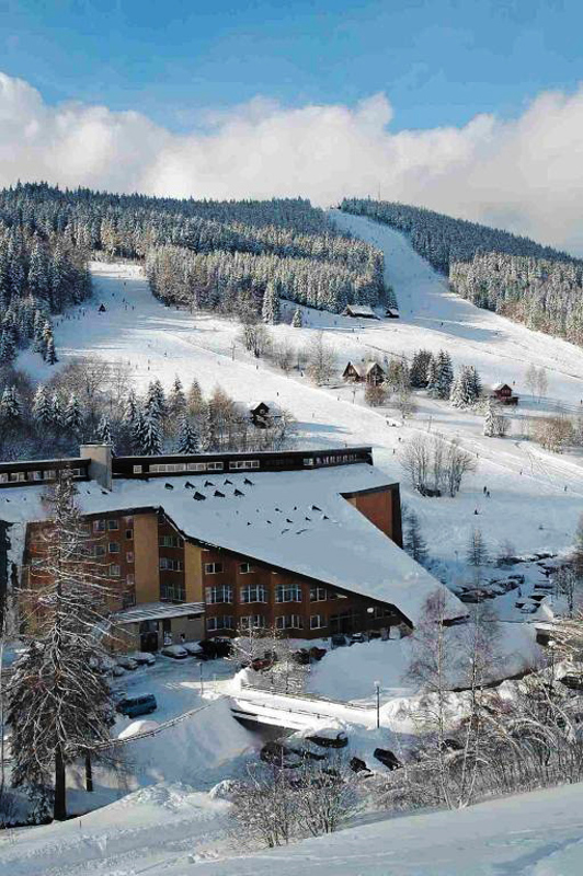 poloha hotelu v klidnější části Harrachova (Rýžoviště) na úpatí Čertovy hory