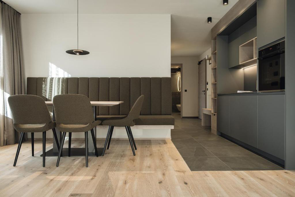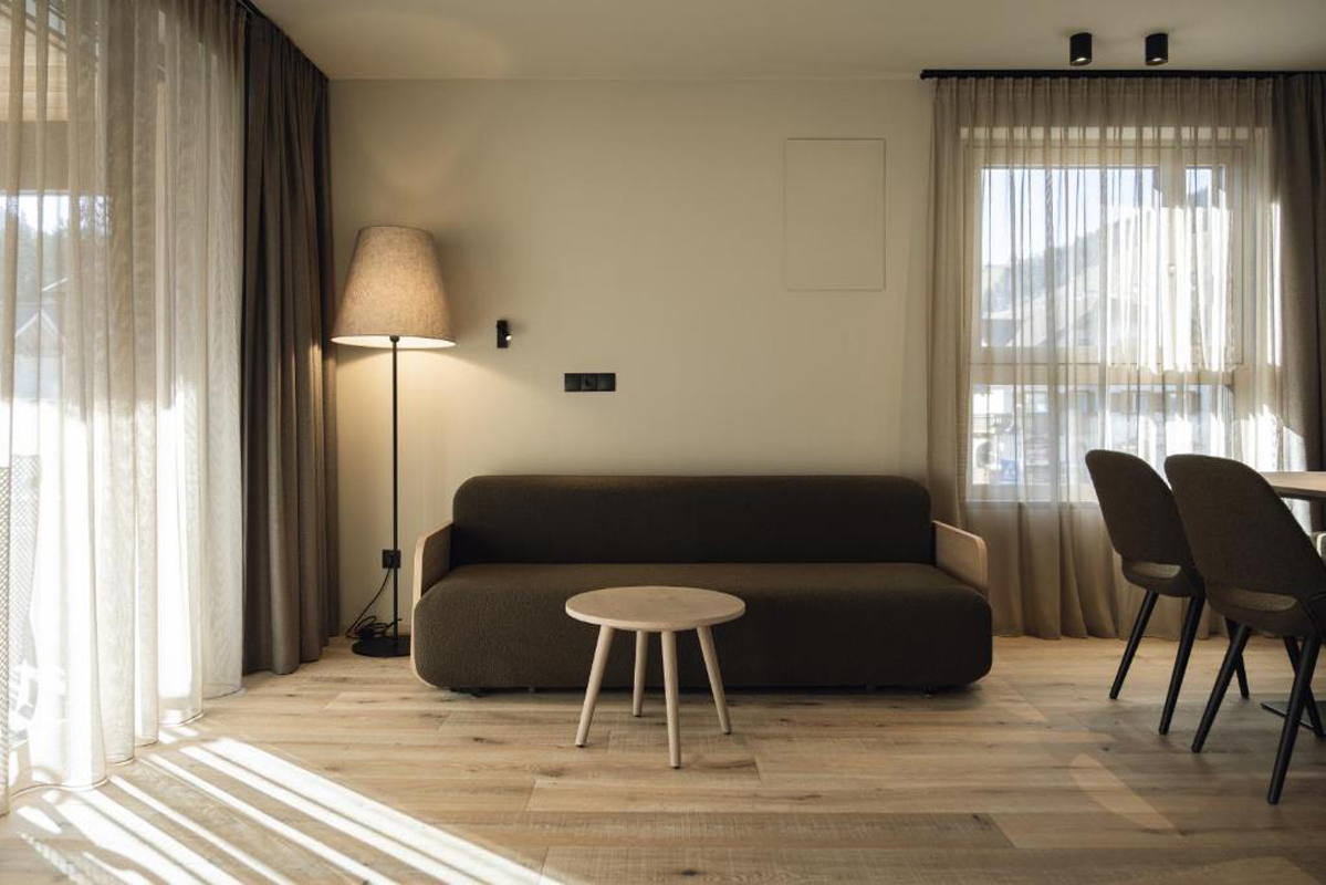 40 m² – 1 ložnice s manželskou postelí, obývací pokoj s kuchyňským koutem a rozkládacím gaučem pro 1 osobu, sociální zařízení, balkon s výhledem na sjezdovky; apartmán je bezbariérový s upravenou koupelnou pro vozíčkáře a handicapované osoby