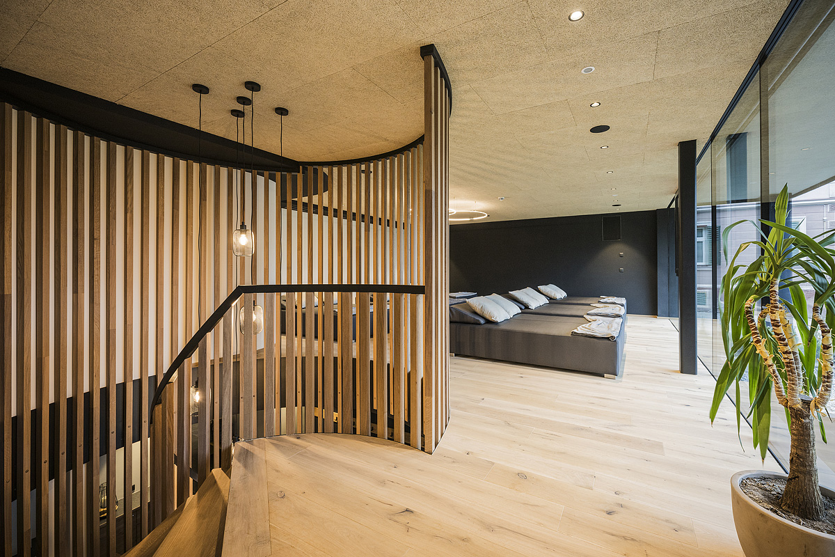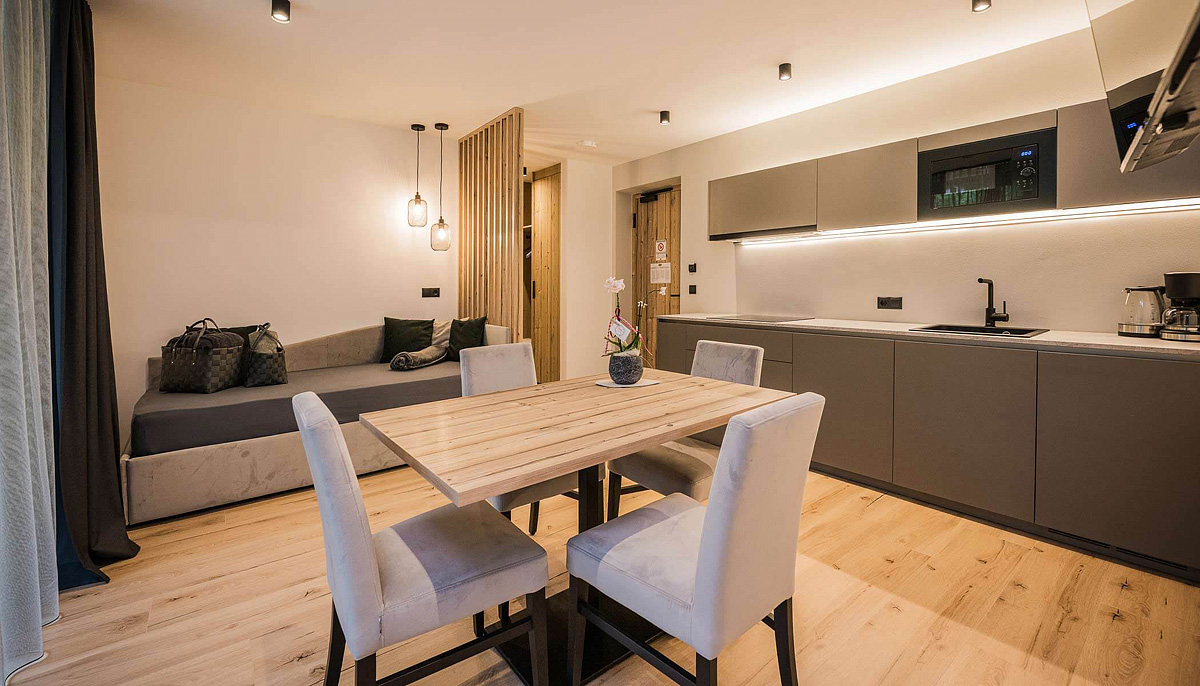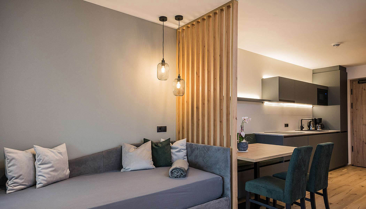 65 m² – obývací pokoj s kuchyňským koutem, manželskou postelí, rozkládacím gaučem pro 2 osoby a samostatnou vanou, privátní sauna, sociální zařízení, 2x balkon
