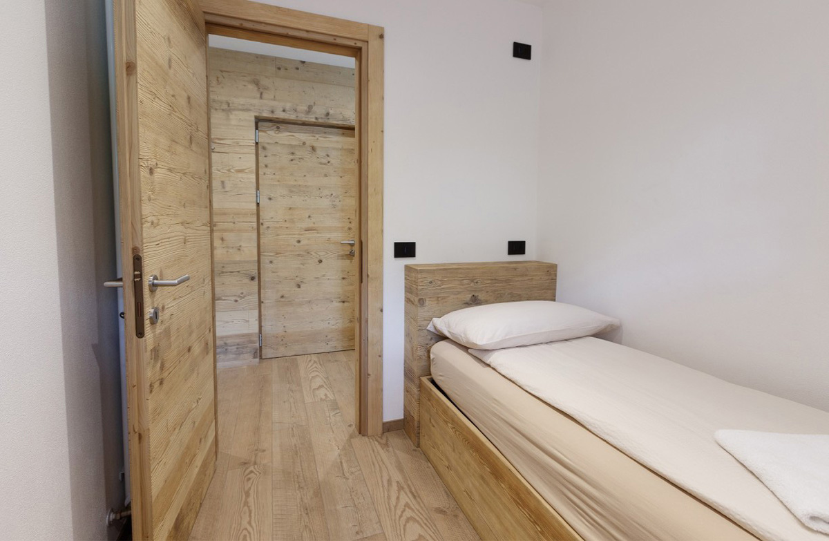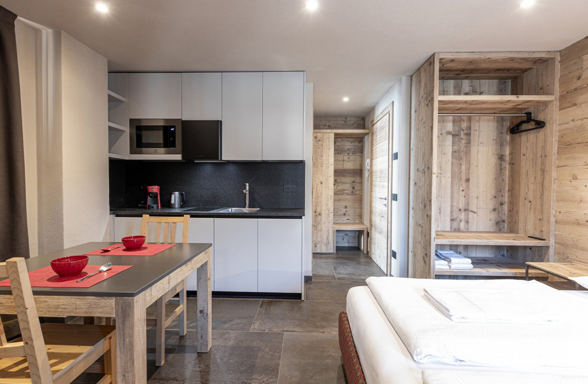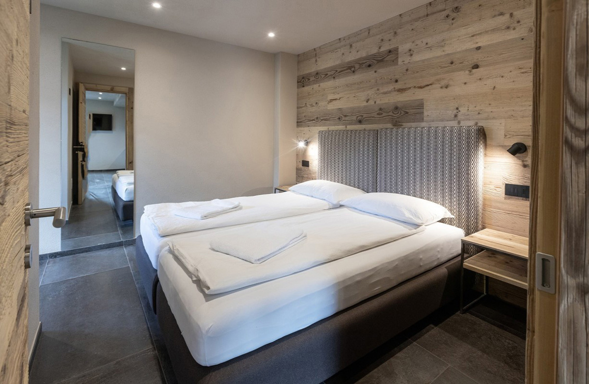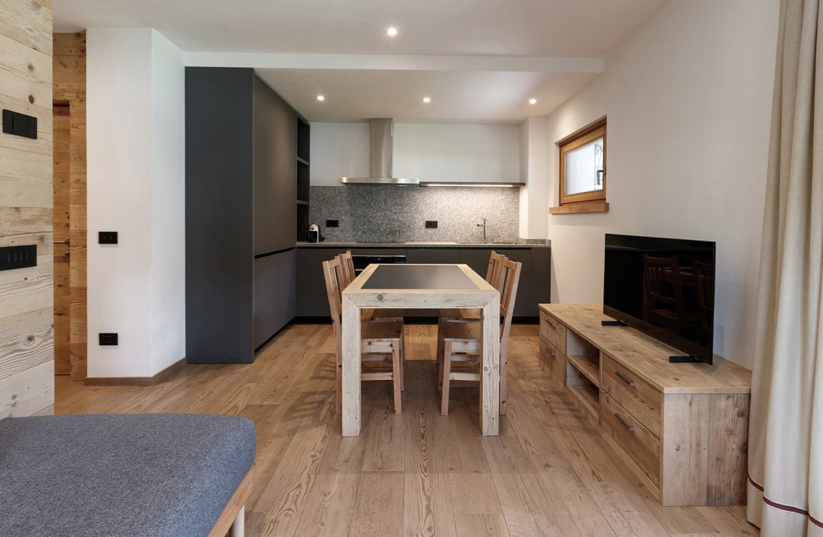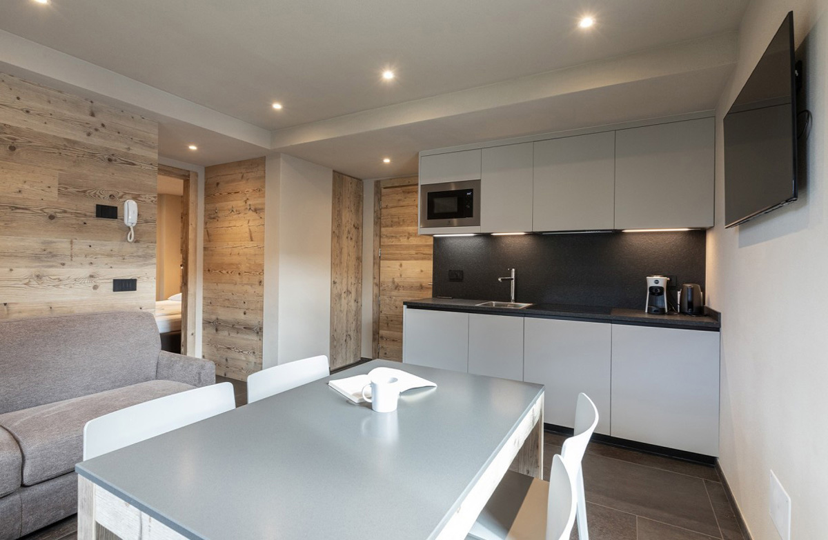 50 m² - 1 ložnice s manželskou postelí či 2 samostatnými lůžky, 1 pokoj s 1 samostatným lůžkem, obývací pokoj s kuchyňským koutem a rozkládacím gaučem pro 1 osobu, sociální zařízení se sprchou, terasa; apartmán se nachází v přízemí