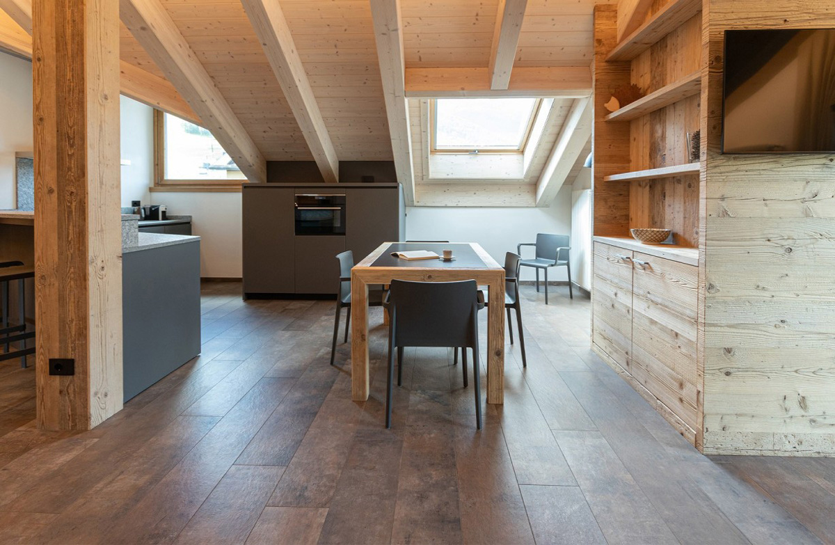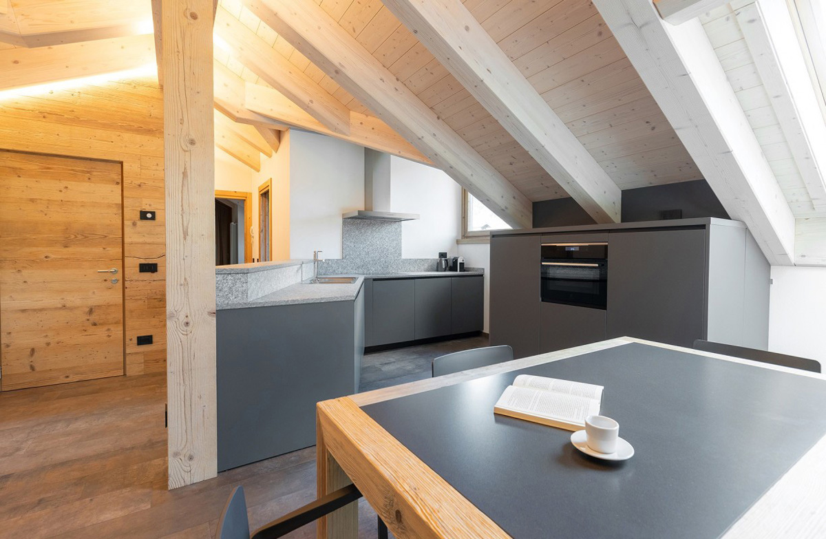 75 m² - 1 ložnice s manželskou postelí, 1 ložnice se 2 samostatnými lůžky, obývací pokoj s kuchyňským koutem a rozkládacím gaučem pro 1 osobu, sociální zařízení se sprchou, balkon; apartmán se nachází v podkroví