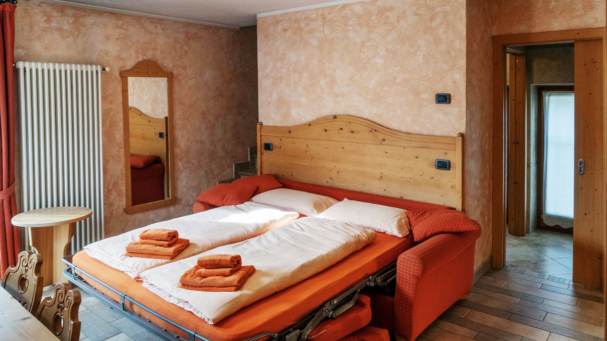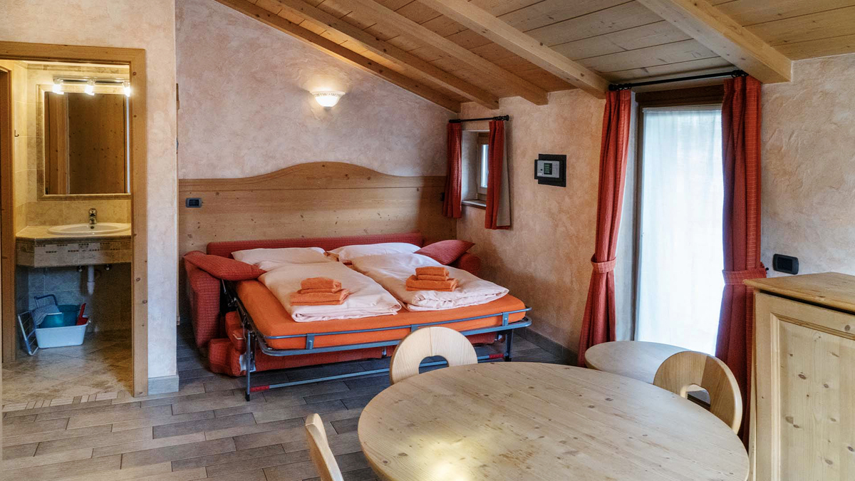 dvoupodlažní; 1. podlaží – obývací pokoj s kuchyňským koutem a rozkládacím gaučem pro 2 osoby, sociální zařízení se sprchou, malý balkon, 2. podlaží - 1 ložnice s manželskou postelí nebo 2 samostatnými lůžky, 1 ložnice se 2/3 samostatnými lůžky, sociální zařízení se sprchou; vchod do apartmánu v 1. patře
