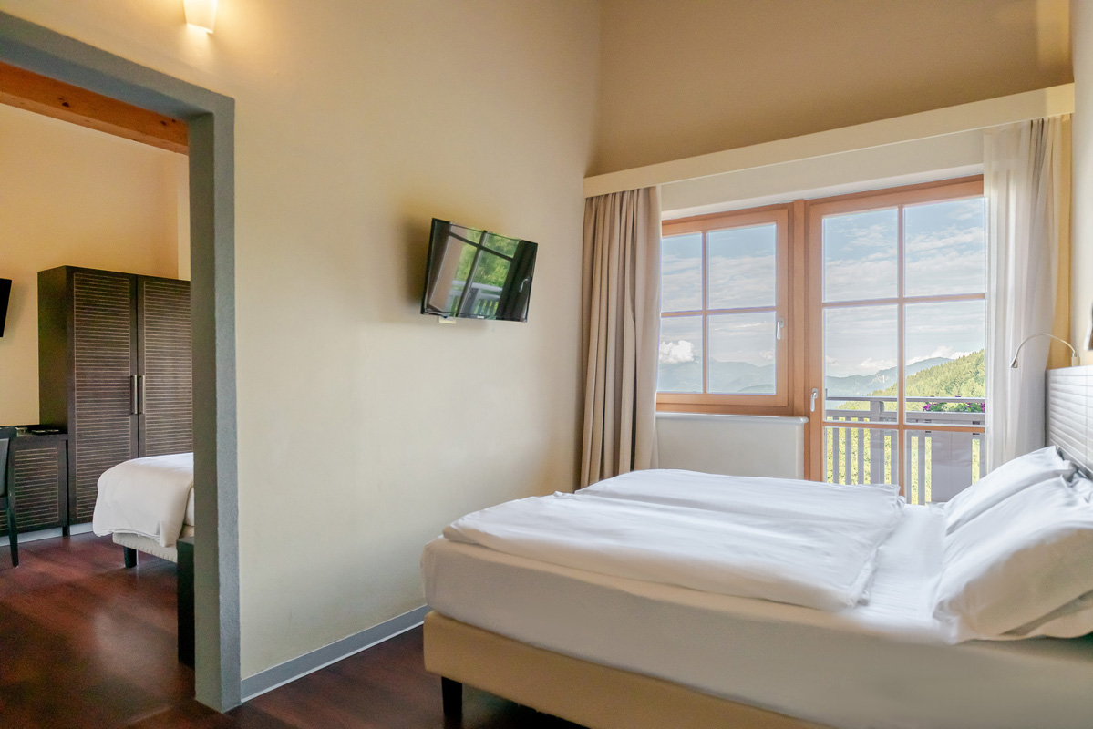 pokoj s manželskou postelí a 2 či 3 samostatnými lůžky či 1 samostatným lůžkem a rozkládacím gaučem pro 2 osoby, sociální zařízení zpravidla se sprchou, zpravidla balkon