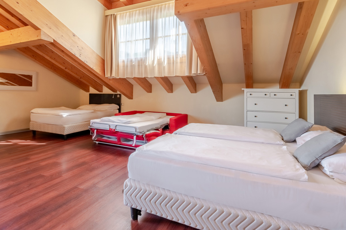 pokoj s manželskou postelí a rozkládacím gaučem pro 1 či 2 osoby či 1 či 2 lůžky ve zvýšeném mezipatře, sociální zařízení zpravidla se sprchou, zpravidla balkon