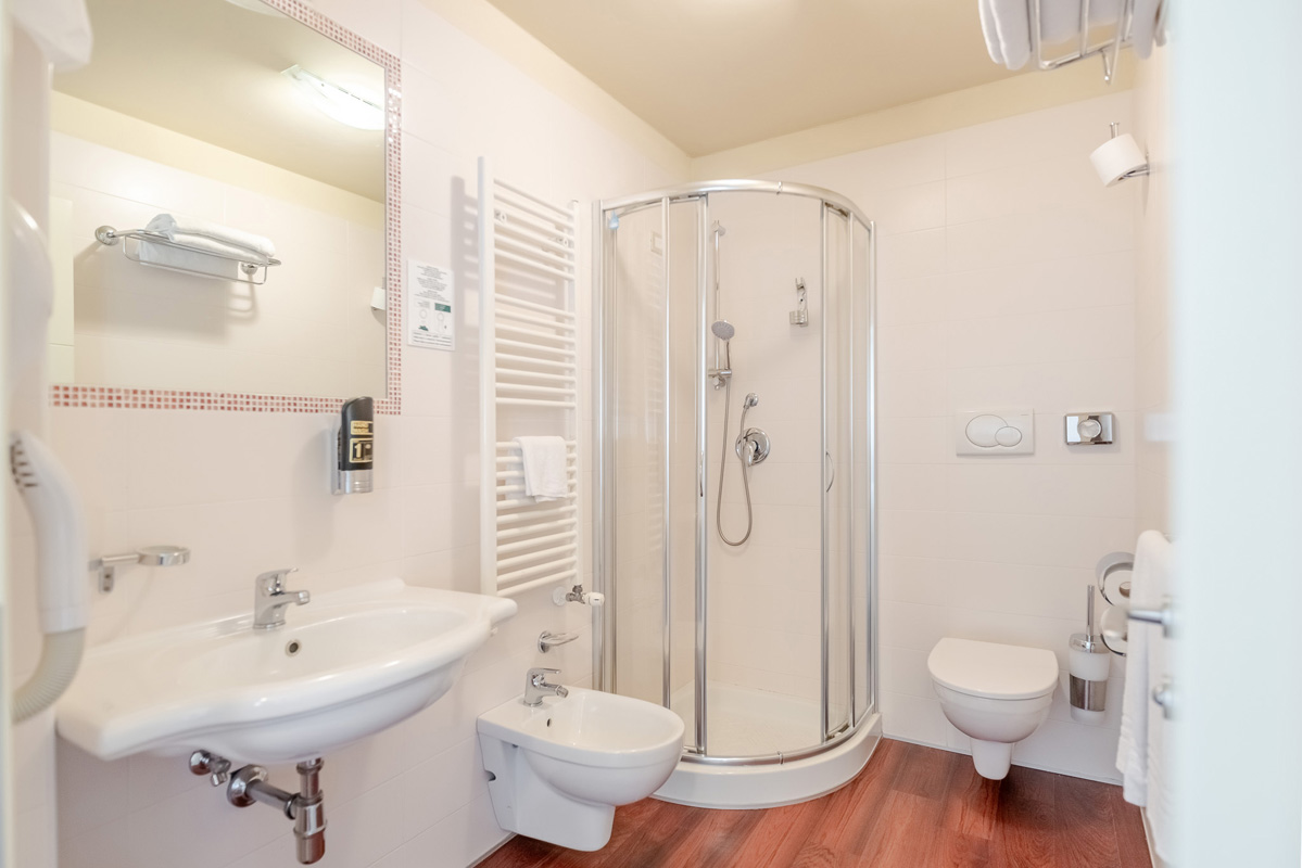 pokoj s manželskou postelí s oddělitelnými lůžky a přistýlkou pro 1 dítě do nedovršených 15 let, sociální zařízení zpravidla se sprchou, balkon