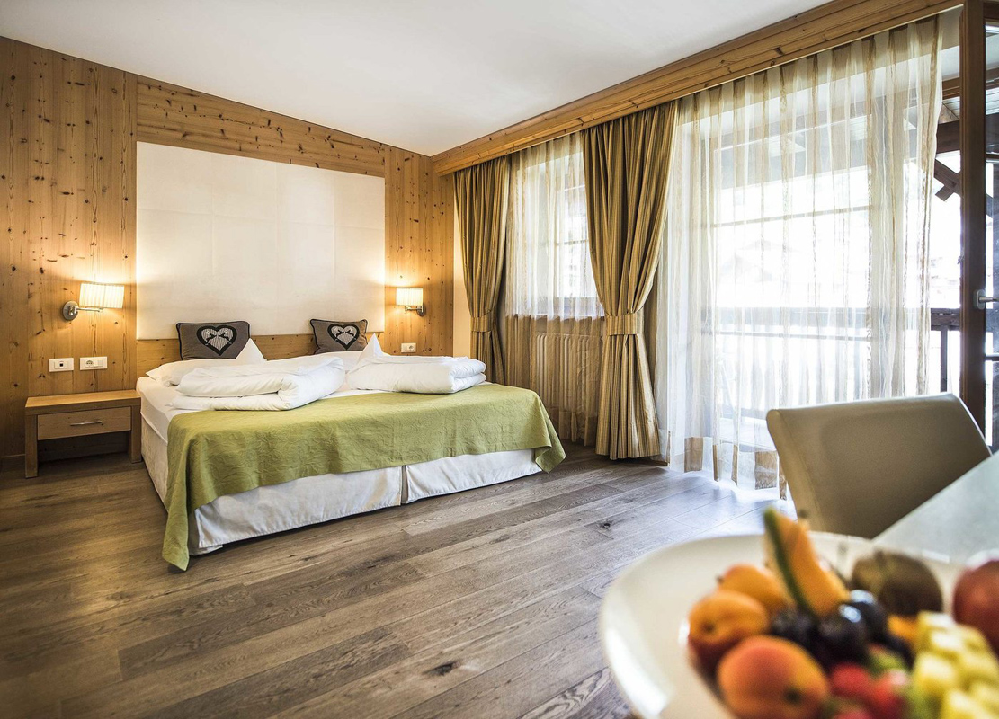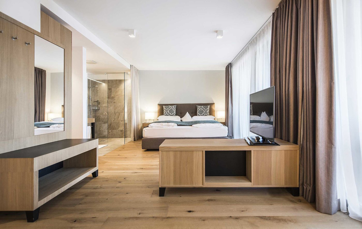 Junior Suite Dolomiten 2/3/4 - 36 m² - pokoj s manželskou postelí a rozkládacím gaučem pro 2 osoby, sociální zařízení se sprchou, samostatné WC, balkon