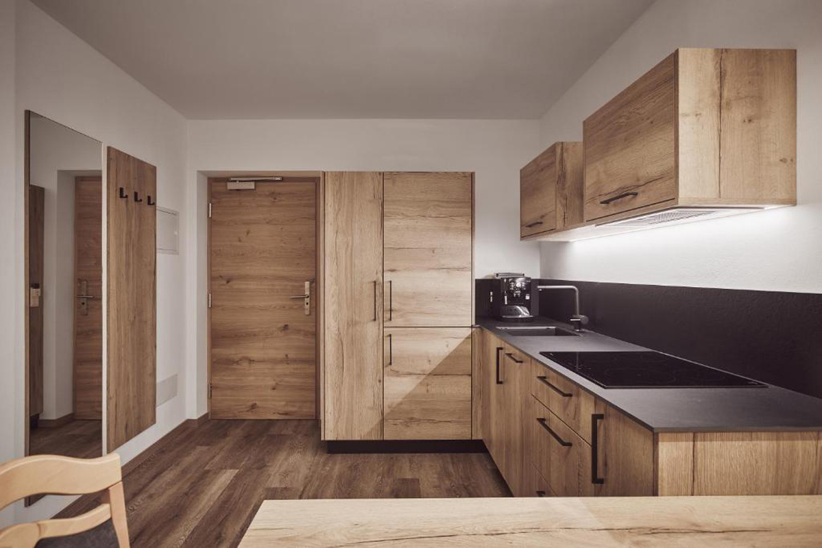 45 až 55 m² - 1 ložnice s manželskou postelí, obývací pokoj s kuchyňským koutem, rozkládacím gaučem pro 2 osoby a rozkládacím křeslem pro 1 osobu, sociální zařízení, 2x balkon; apartmán se nachází v podkroví
